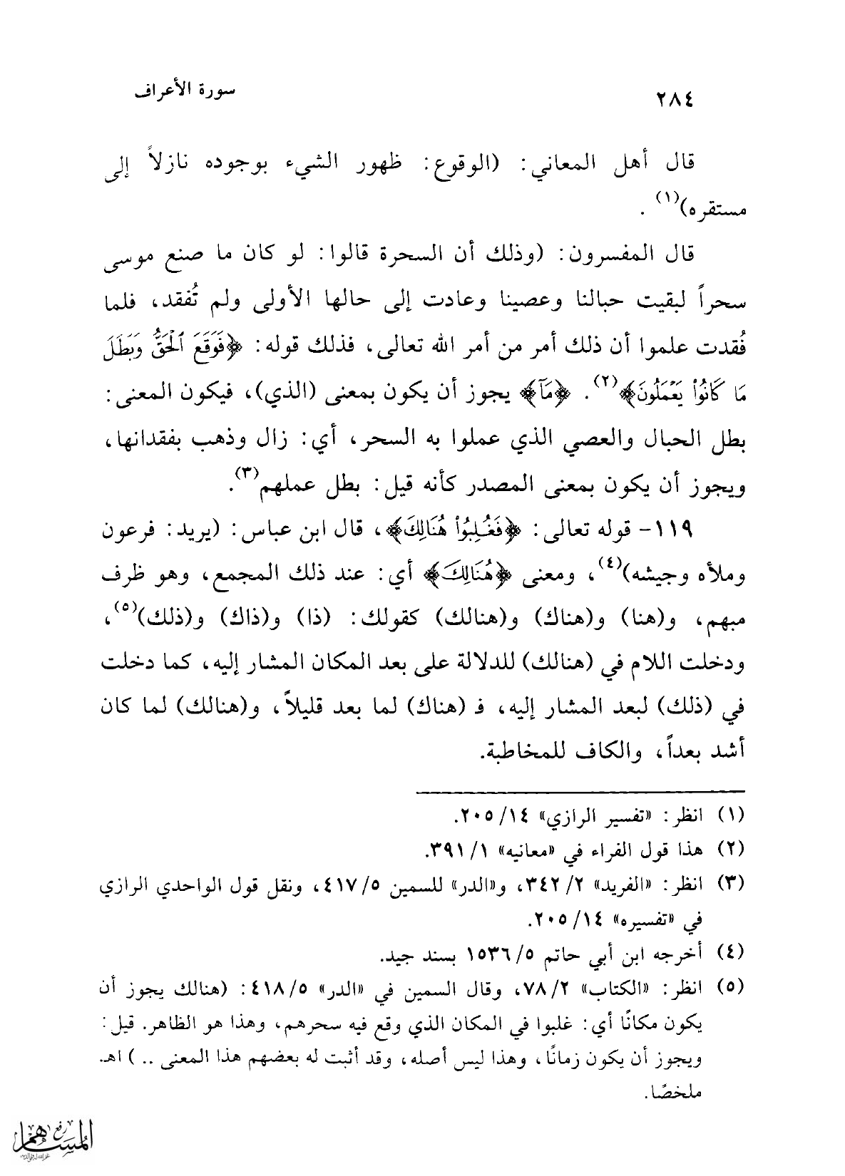 (¬5) انظر: "الكتاب" 2/ 78، وقال السمين في "الدر" 5/ 418: (هنالك يجوز أن يكون مكانًا أي: غلبوا في المكان الذي وقع فيه سحرهم، وهذا هو الظاهر. قيل: ويجوز أن يكون زمانًا، وهذا ليس أصله، وقد أثبت له بعضهم هذا المعنى ..) اهـ. ملخصًا.