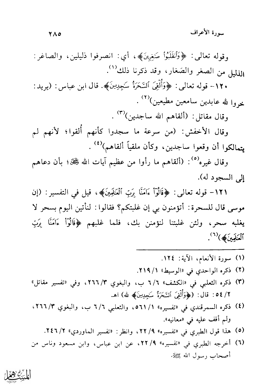 120 - قوله تعالى: {وَأُلْقِيَ السَّحَرَةُ سَاجِدِينَ}. قال ابن عباس: (يريد: خروا لله عابدين سامعين مطيعين) (¬2).
