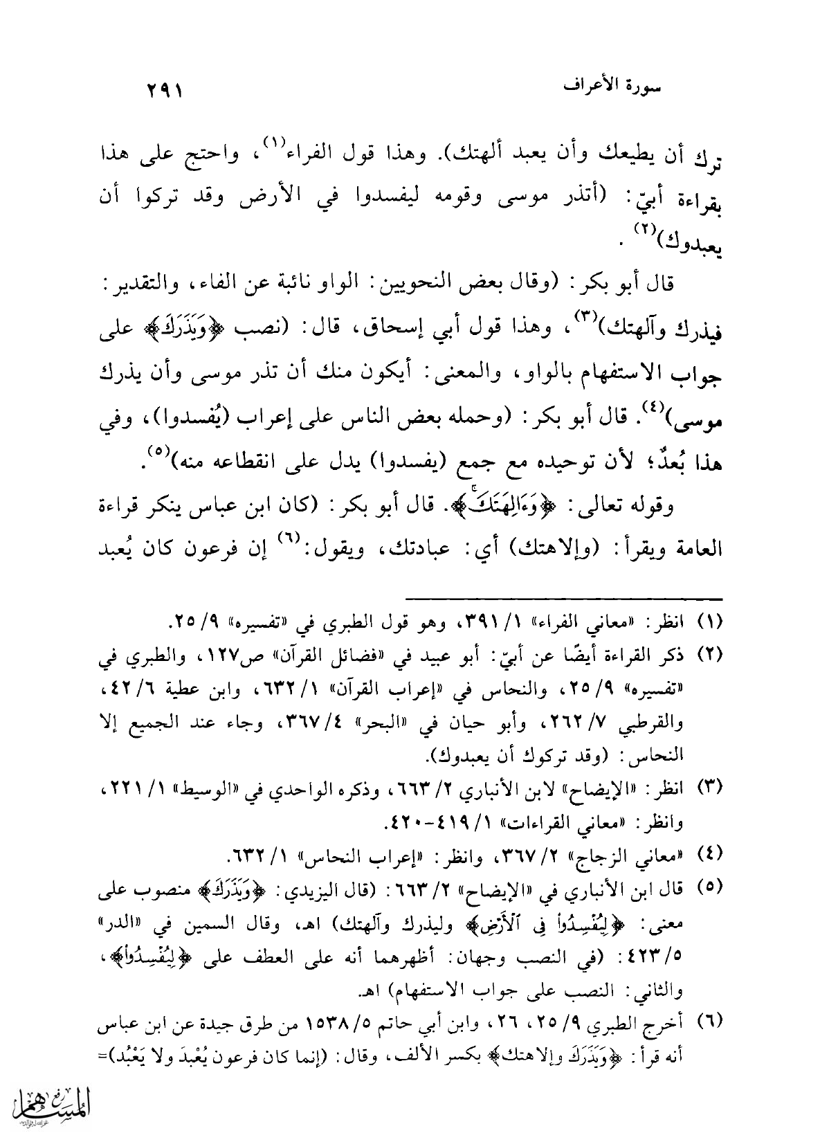 (¬5) قال ابن الأنباري في "الإيضاح" 2/ 663: (قال اليزيدي: {وَيَذَرَكَ} منصوب على معنى: {لِيُفْسِدُوا فِي الْأَرْضِ} وليذرك وآلهتك) اهـ. وقال السمين في "الدر" 5/ 423: (في النصب وجهان: أظهرهما أنه على العطف على {لِيُفْسِدُوا}، والثاني: النصب على جواب الاستفهام) اهـ.