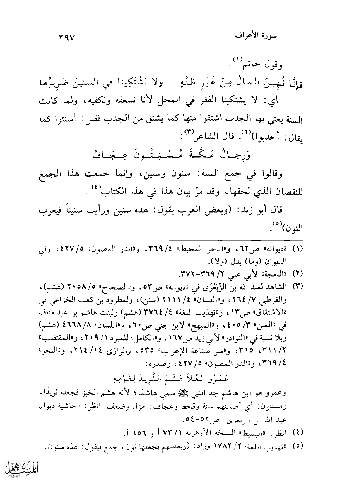 (¬3) الشاهد لعبد الله بن الزِّبَعْرَى في "ديوانه" ص 53، و"الصحاح" 5/ 2058 (هشم)، والقرطبي 7/ 264، و"اللسان" 4/ 2111 (سنن)، ولمطرود بن كعب الخزاعي في "الاشتقاق" ص 13، و"تهذيب اللغة" 4/ 3764 (هشم) ولبنت هاشم بن عبد مناف في "العين" 3/ 405، و"المبهج" لابن جني ص 60، و"اللسان" 8/ 4668 (هشم) وبلا نسبة في "النوادر" لأبي زيد ص 167، و"الكامل" للمبرد 1/ 209، و"المقتضب" 2/ 311، 315، و"سر صناعة الإعراب" 535، والرازي 14/ 214، و"البحر" 4/ 369، و"الدر المصون" 5/ 427، وصدره: