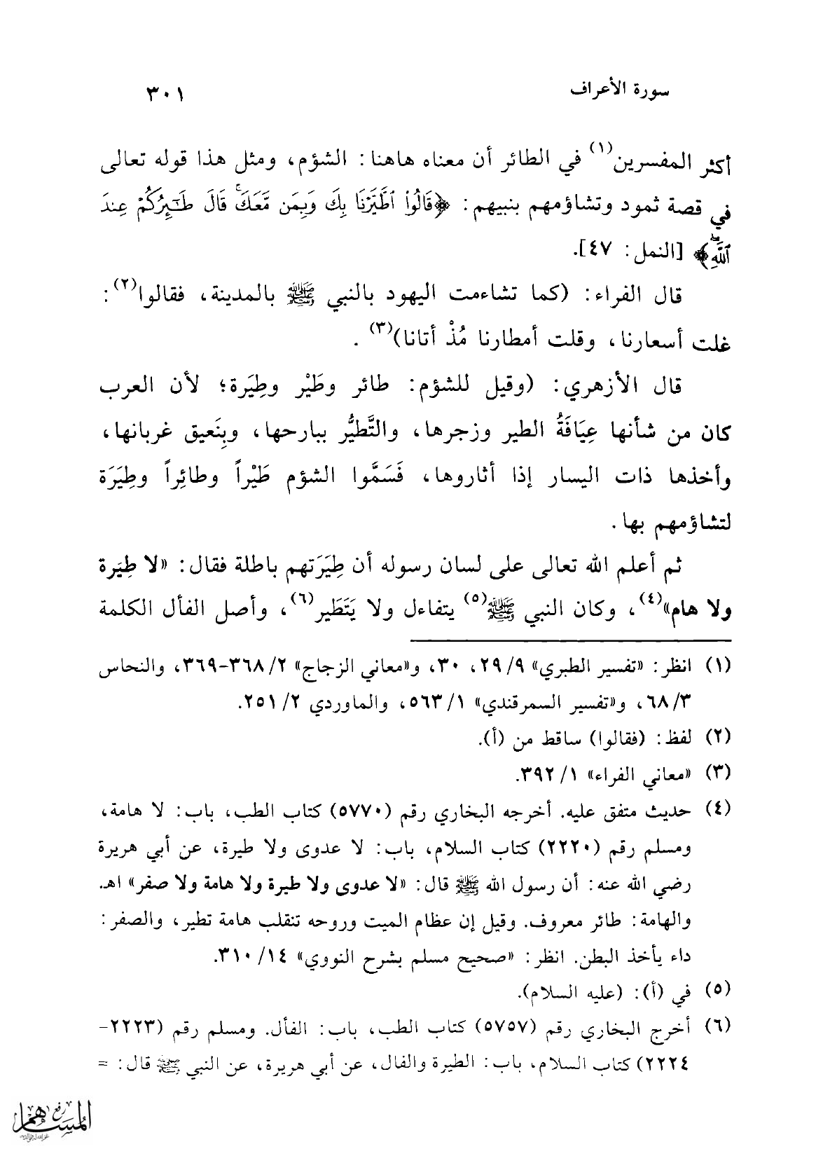 ثم أعلم الله تعالى على لسان رسوله أن طِيَرَتهم باطلة فقال: "لا طِيَرة ولا هام" (¬4)، وكان النبي - صلى الله عليه وسلم - (¬5) يتفاءل ولا يَتَطَير (¬6)، وأصل الفأل الكلمة