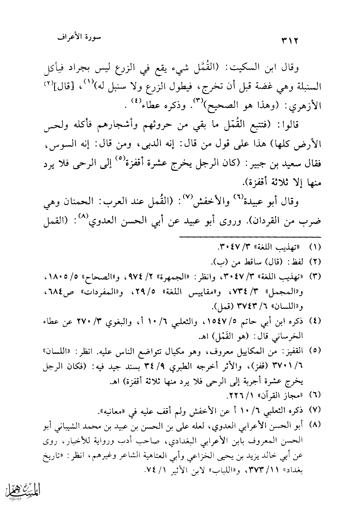 وقال ابن السكيت: (القُمَّل شيء يقع في الزرع ليس بجراد فيأكل السنبلة وهي غضة قبل أن تخرج، فيطول الزرع ولا سنبل له) (¬1)، [قال] (¬2) الأزهري: (وهذا هو الصحيح) (¬3). وذكره عطاء (¬4).