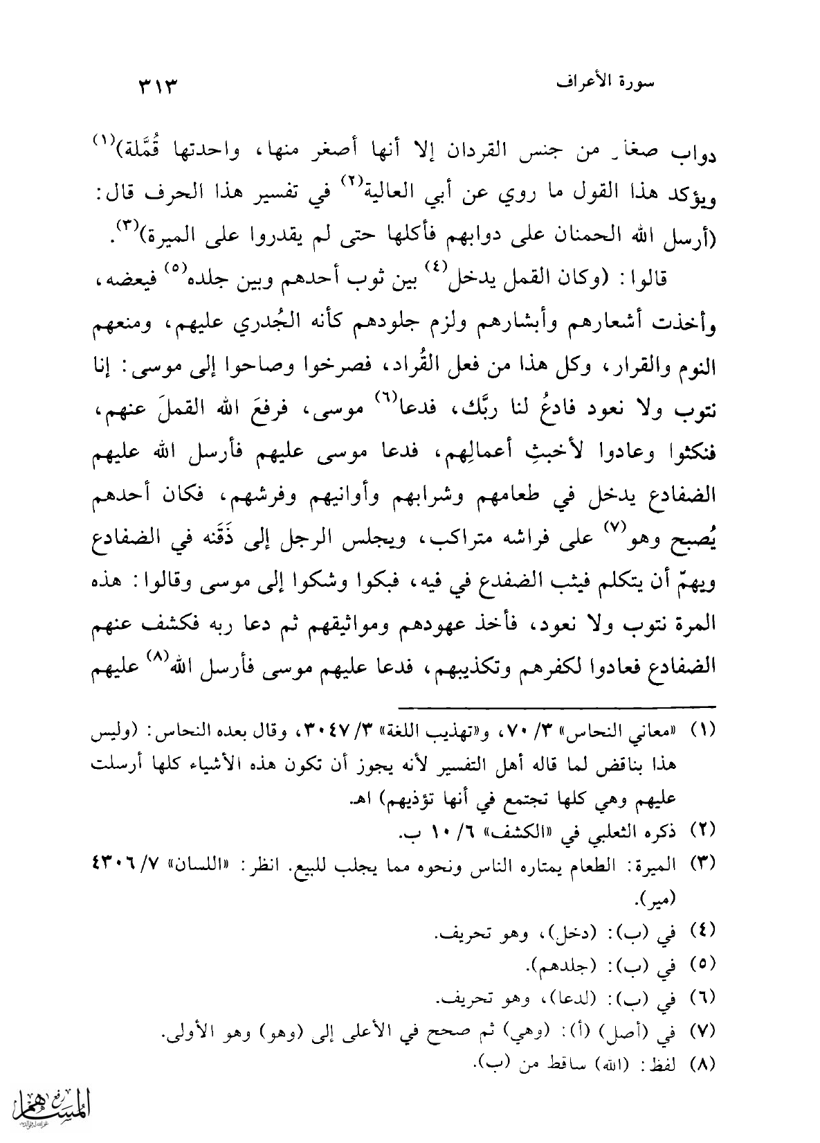(¬1) "معاني النحاس" 3/ 70، و"تهذيب اللغة" 3/ 3047، وقال بعده النحاس: (وليس هذا بناقض لما قاله أهل التفسير لأنه يجوز أن تكون هذه الأشياء كلها أرسلت عليهم وهي كلها تجتمع في أنها تؤذيهم) اهـ.