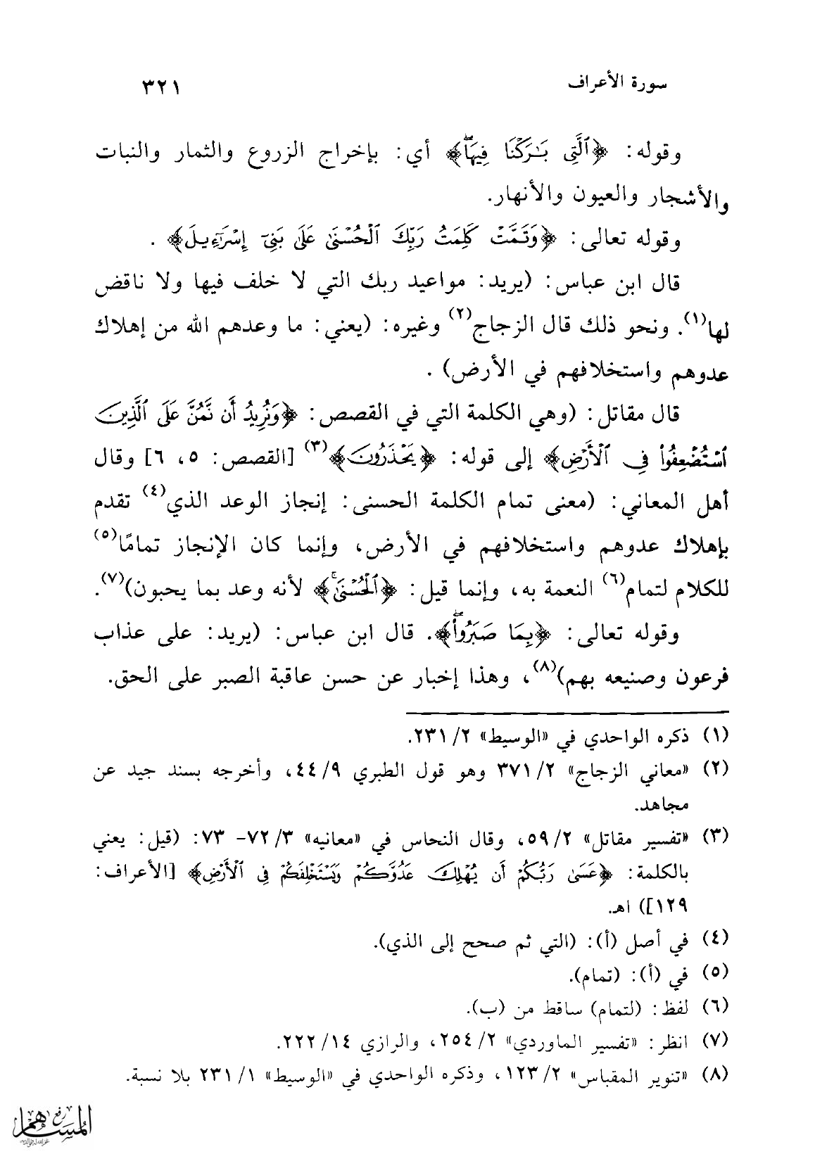 قال مقاتل: (وهي الكلمة التي في القصص: {وَنُرِيدُ أَنْ نَمُنَّ عَلَى الَّذِينَ اسْتُضْعِفُوا فِي الْأَرْضِ} إلى قوله: {يَحْذَرُونَ} (¬3) [القصص: 5, 6] وقال أهل المعاني: (معنى تمام الكلمة الحسنى: إنجاز الوعد الذي (¬4) تقدم بإهلاك عدوهم واستخلافهم في الأرض، وإنما كان الإنجاز تمامًا (¬5) للكلام لتمام (¬6) النعمة به، وإنما قيل: {الْحُسْنَى} لأنه وعد بما يحبون) (¬7).