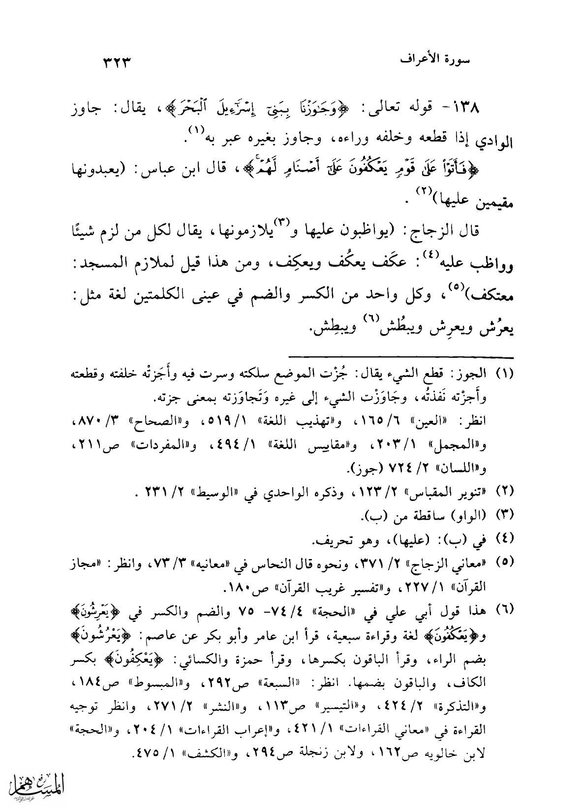 138 - قوله تعالى: {وَجَاوَزْنَا بِبَنِي إِسْرَائِيلَ الْبَحْرَ}، يقال: جاوز الوادي إذا قطعه وخلفه وراءه، وجاوز بغيره عبر به (¬1).