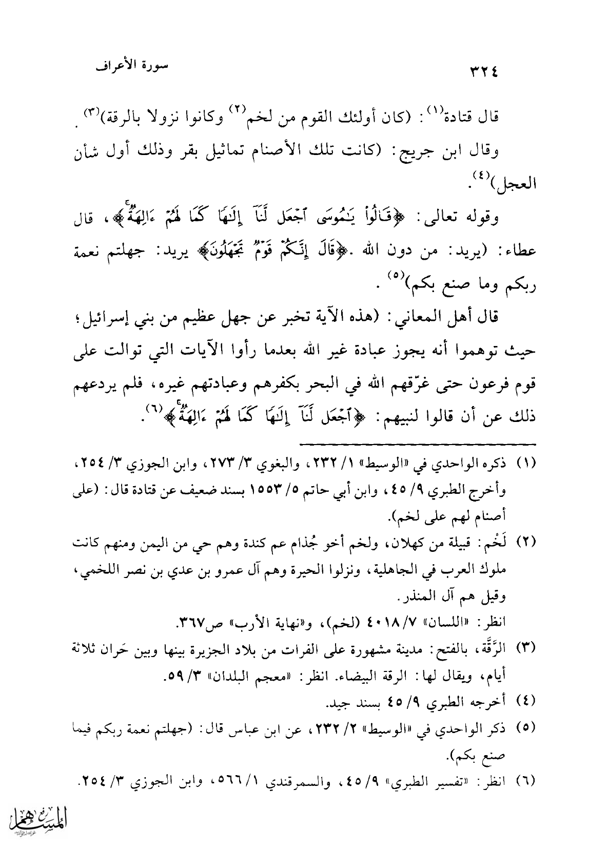 وقوله تعالى: {قَالُوا يَا مُوسَى اجْعَلْ لَنَا إِلَهًا كَمَا لَهُمْ آلِهَةٌ}، قال عطاء: (يريد: من دون الله. {قَالَ إِنَّكُمْ قَوْمٌ تَجْهَلُونَ} يريد: جهلتم نعمة ربكم وما صنع بكم) (¬5).