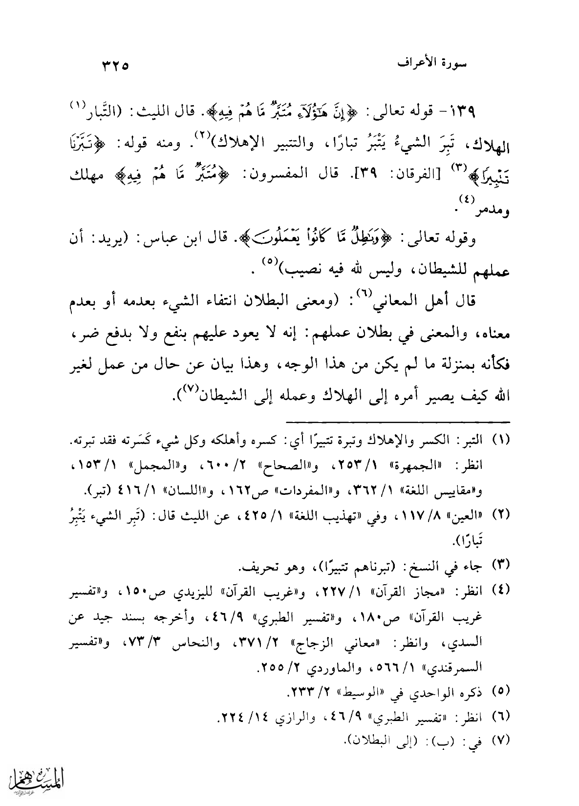 139 - قوله تعالى: {إِنَّ هَؤُلَاءِ مُتَبَّرٌ مَا هُمْ فِيهِ}. قال الليث: (التَّبار (¬1) الهلاك، تَبِرَ الشيءُ يَتْبَرُ تبارًا، والتتبير الإهلاك) (¬2). ومنه قوله: {تَبَّرْنَا تَتْبِيرًا} (¬3) [الفرقان: 39]. قال المفسرون: {مُتَبَّرٌ مَا هُمْ فِيهِ} مهلك ومدمر (¬4).
