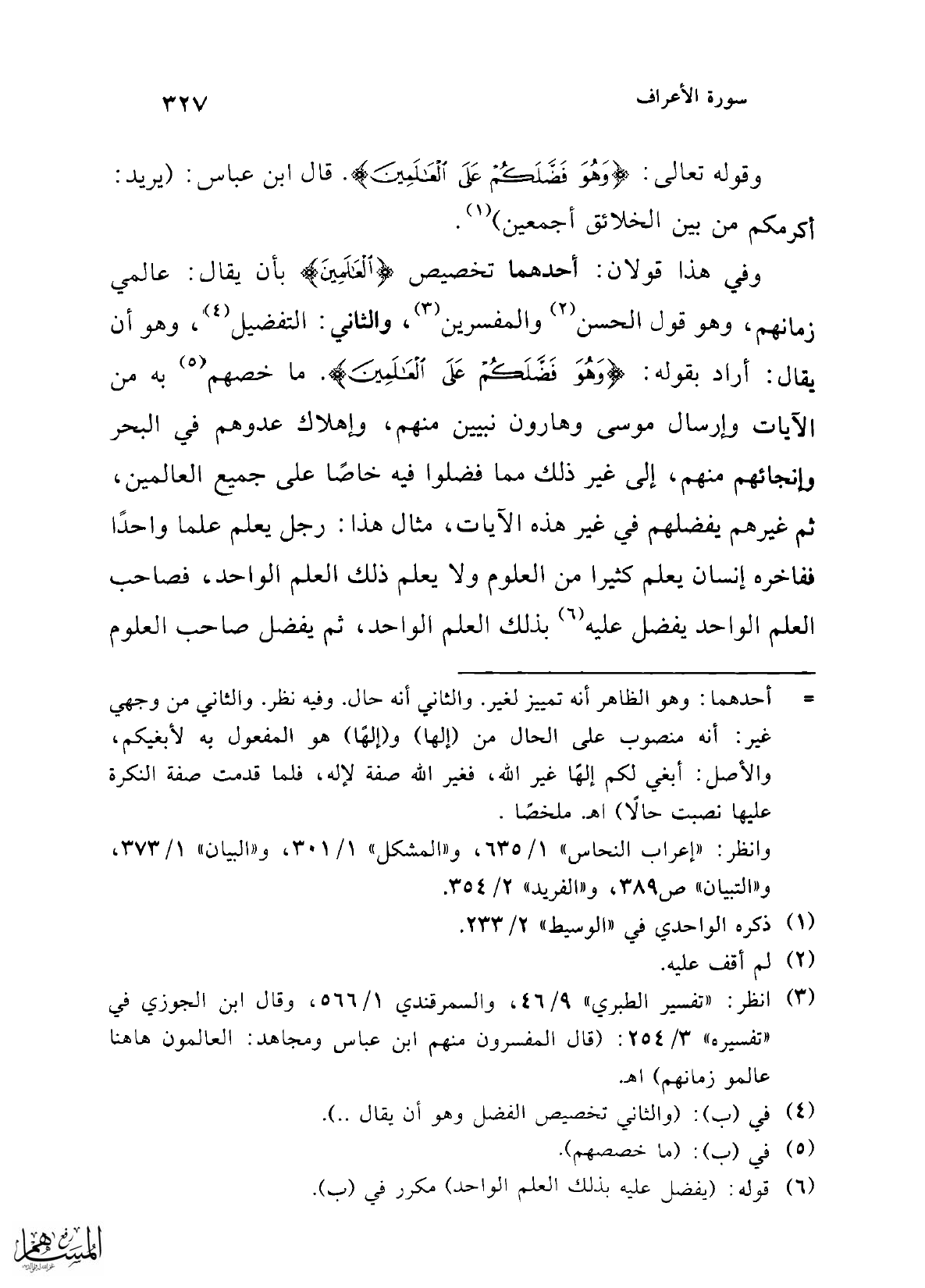 وفي هذا قولان: أحدهما تخصيص {الْعَالَمِينَ} بأن يقال: عالمي زمانهم، وهو قول الحسن (¬2) والمفسرين (¬3)، والثاني: التفضيل (¬4)، وهو أن يقال: أراد بقوله: {وَهُوَ فَضَّلَكُمْ عَلَى الْعَالَمِينَ} ما خصهم (¬5) به من الآيات وإرسال موسى وهارون نبيين منهم، وإهلاك عدوهم في البحر وإنجائهم منهم، إلى غير ذلك مما فضلوا فيه خاصًا على جميع العالمين، ثم غيرهم يفضلهم في غير هذه الآيات، مثال هذا: رجل يعلم علماً واحداً ففاخره إنسان يعلم كثيرا من العلوم ولا يعلم ذلك العلم الواحد، فصاحب العلم الواحد يفضل عليه (¬6) بذلك العلم الواحد، ثم يفضل صاحب العلوم