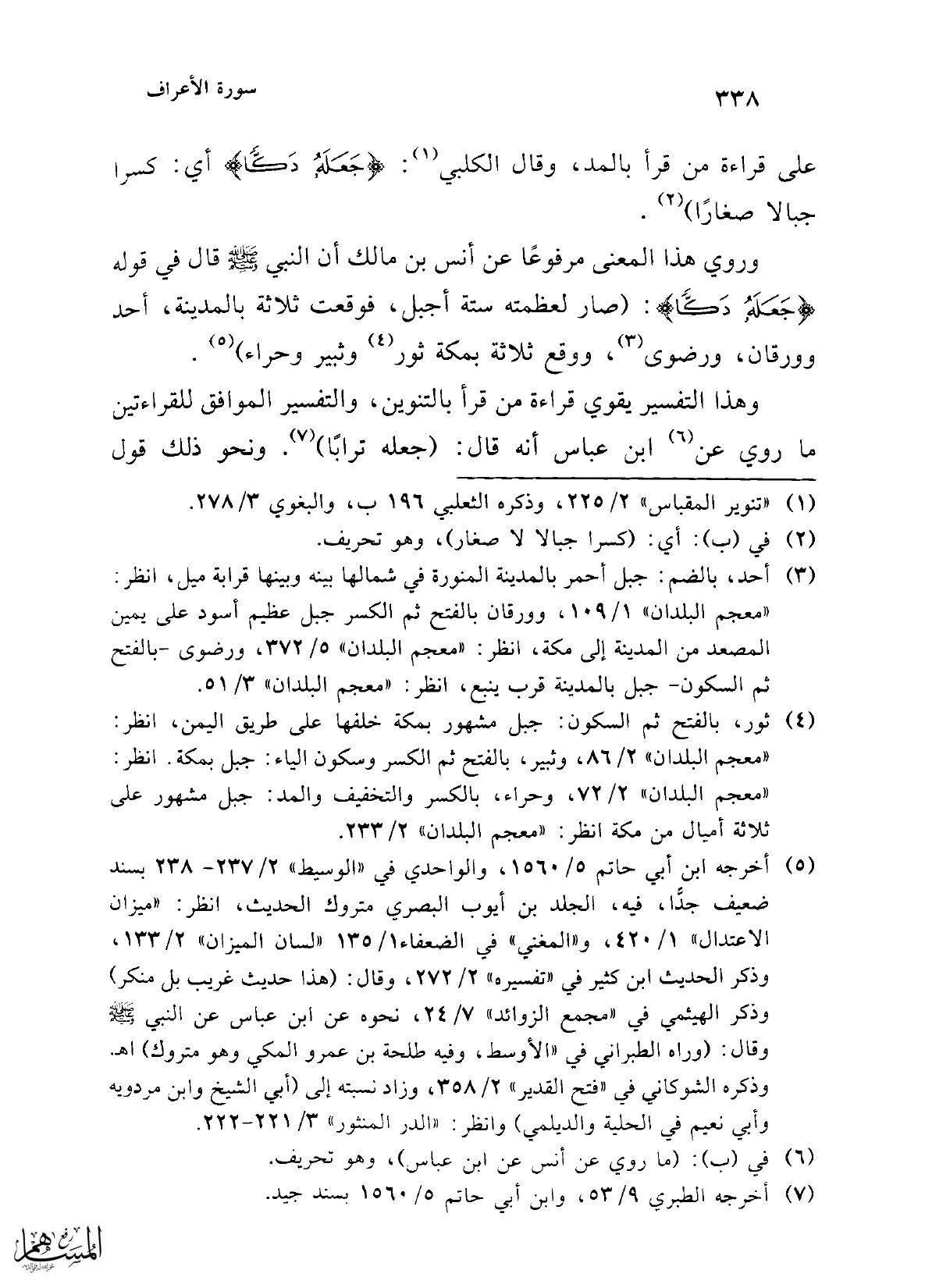 وروي هذا المعنى مرفوعًا عن أنس بن مالك أن النبي - صلى الله عليه وسلم - قال في قوله {جَعَلَهُ دَكًّا}: (صار لعظمته ستة أجبل، فوقعت ثلاثة بالمدينة، أحد وورقان، ورضوى (¬3)، ووقع ثلاثة بمكة ثور (¬4) وثبير وحراء) (¬5).
