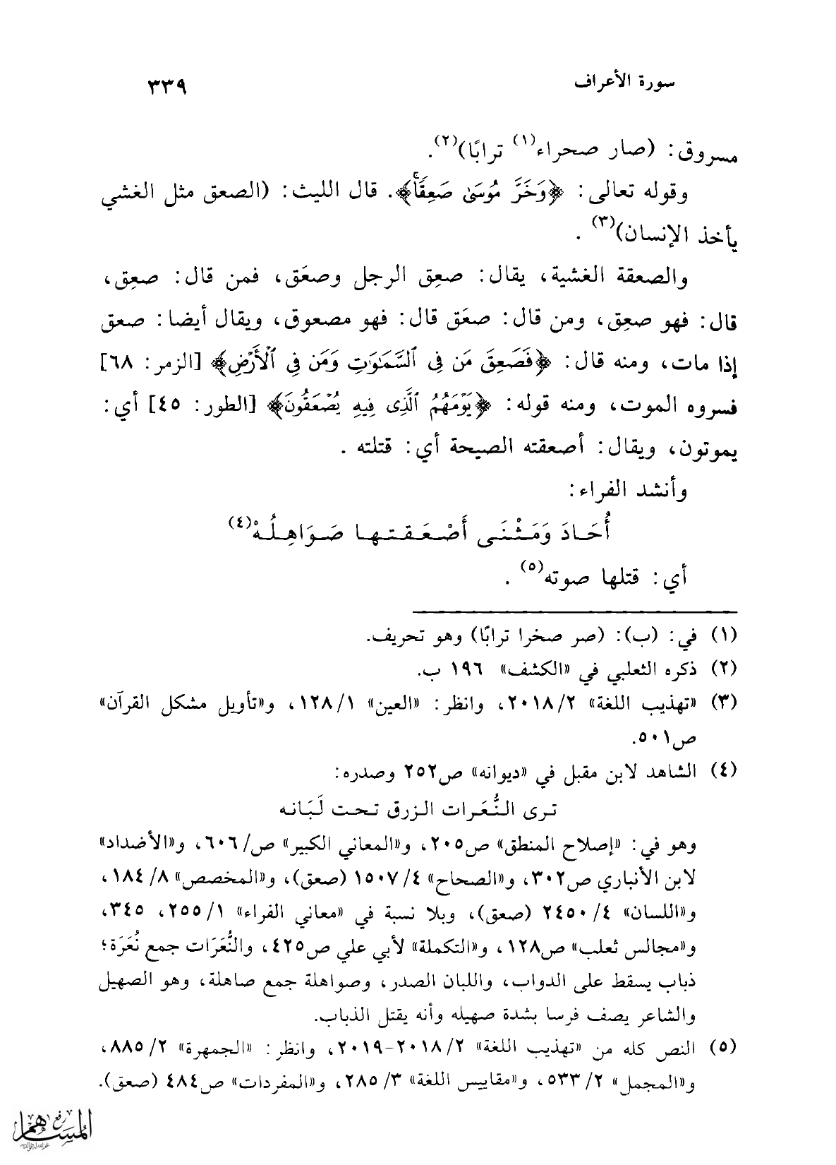 (¬5) النص كله من "تهذيب اللغة" 8/ 2012 - 2019، وانظر: "الجمهرة" 2/ 885، و"المجمل" 2/ 533؛ و"مقاييس اللغة" 3/ 285، و"المفردات" ص 484 (صعق).