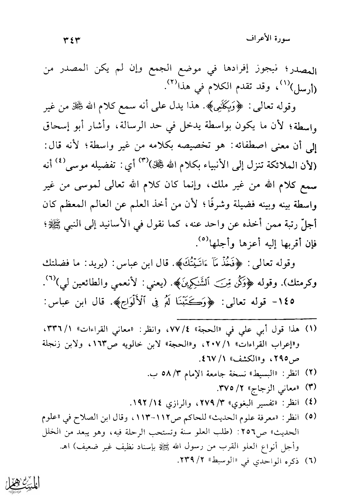 وقوله تعالى: {وَبِكَلَامِي}. هذا يدل على أنه سمع كلام الله عز وجل من غير واسطة؛ لأن ما يكون بواسطة يدخل في حد الرسالة، وأشار أبو إسحاق إلى أن معنى اصطفائه: هو تخصيصه بكلامه من غير واسطة؛ لأنه قال: (لأن الملائكة تنزل إلى الأنبياء بكلام الله عز وجل) (¬3) أي: تفضيله موسى (¬4) أنه سمع كلام الله من غير ملك، وإنما كان كلام الله تعالى لموسى من غير واسطة بينه وبينه فضيلة وشرفًا؛ لأن من أخذ العلم عن العالم المعظم كان أجلّ رتبة ممن أخذه عن واحد عنه، كما نقول في الأسانيد إلى النبي - صلى الله عليه وسلم -؛ فإن أقربها إليه أعزها وأجلها (¬5).