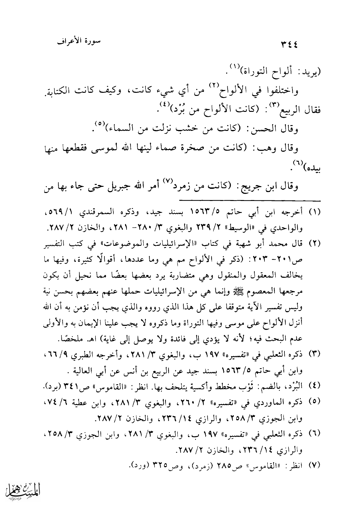 (¬2) قال محمد أبو شهبة في كتاب "الإسرائيليات والموضوعات" في كتب التفسير ص 201 - 203: (ذكر في الألواح مم هي وما عددها، أقوالًا كثيرة، وفيها ما يخالف المعقول والمنقول وهي متضاربة يرد بعضها بعضًا مما نحيل أن يكون مرجعها المعصوم - صلى الله عليه وسلم - وإنما هي من الإسرائيليات حملها عنهم بعضهم بحسن نية وليس تفسير الآية متوقفا على كل هذا الذي رووه والذي يجب أن نؤمن به أن الله أنزل الألواح على موسى وفيها التوراة وما ذكروه لا يجب علينا الإيمان به والأولى عدم البحث فيه؛ لأنه لا يؤدي إلى فائدة ولا يوصل إلى غاية) اهـ. ملخصًا.