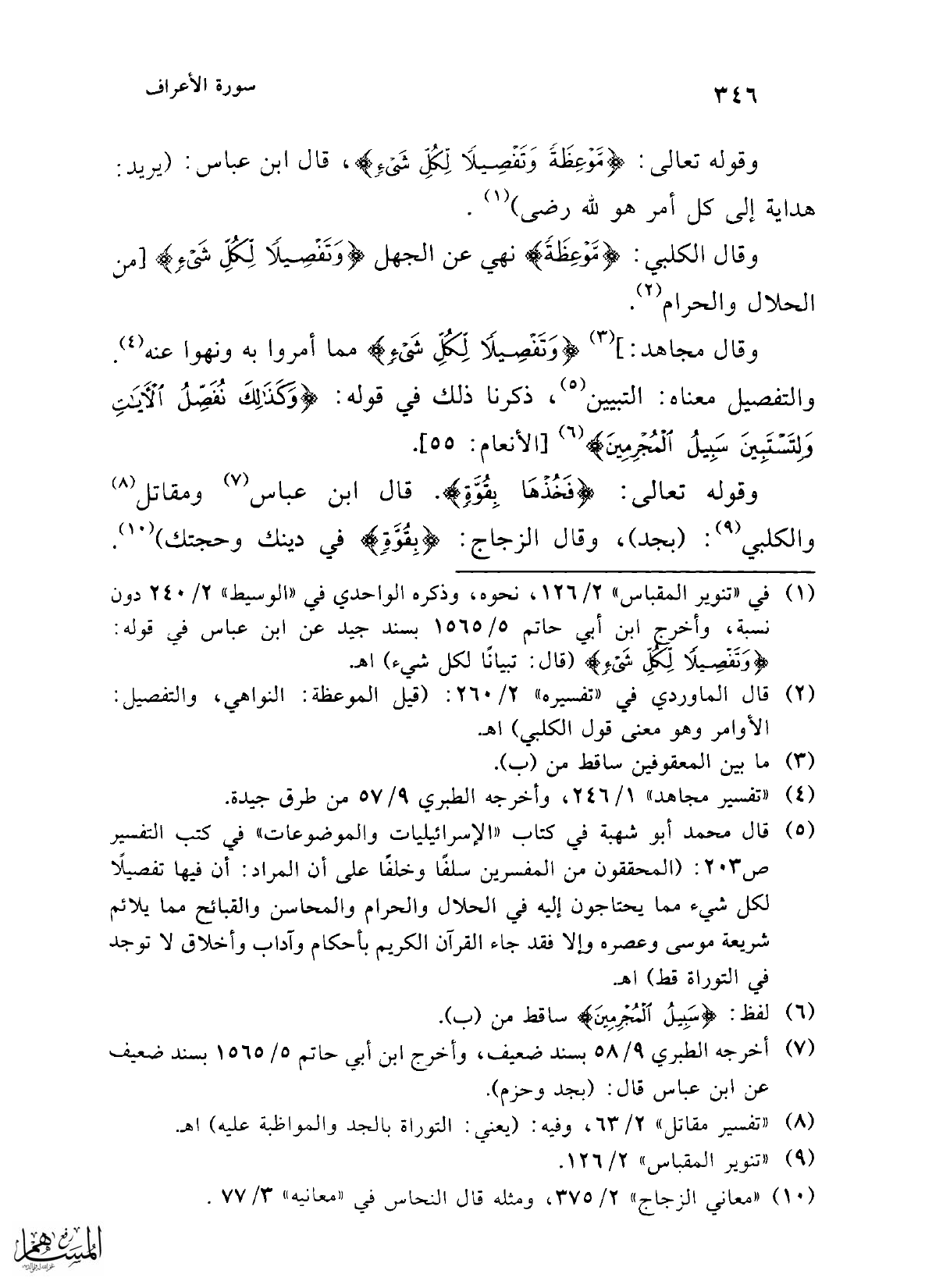 (¬5) قال محمد أبو شهبة في كتاب "الإسرائيليات والموضوعات" في كتب التفسير ص 203: (المحققون من المفسرين سلفًا وخلفًا على أن المراد: أن فيها تفصيلًا لكل شيء مما يحتاجون إليه في الحلال والحرام والمحاسن والقبائح مما يلائم شريعة موسى وعصره وإلا فقد جاء القرآن الكريم بأحكام وآداب وأخلاق لا توجد في التوراة قط) اهـ.
