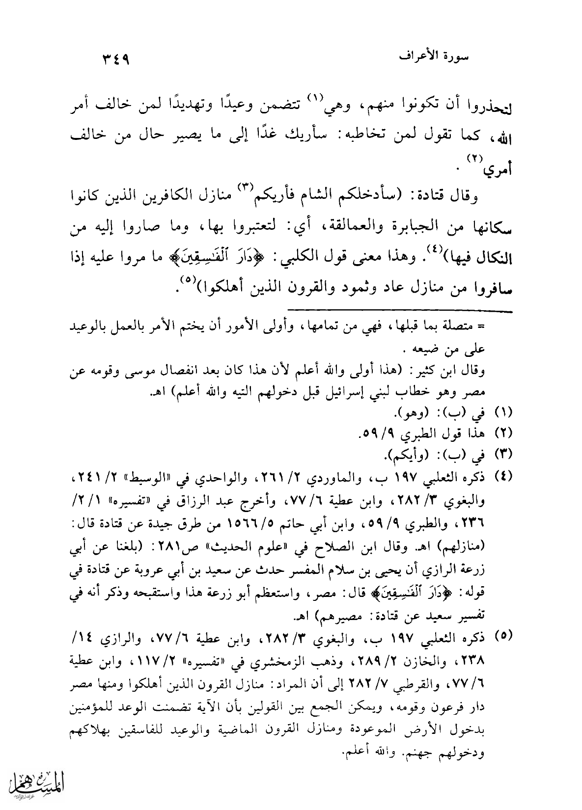 (¬4) ذكره الثعلبي 197 ب، والماوردي 2/ 261، والواحدي في "الوسيط" 2/ 241، والبغوي 3/ 282، وابن عطية 6/ 77، وأخرج عبد الرزاق في "تفسيره" 1/ 2/ 236، والطبري 9/ 59، وابن أبي حاتم 5/ 1566 من طرق جيدة عن قتادة قال: (منازلهم) اهـ. وقال ابن الصلاح في "علوم الحديث" ص 281: (بلغنا عن أبي زرعة الرازي أن يحيى بن سلام المفسر حدث عن سعيد بن أبي عروبة عن قتادة في قوله: {دَارَ الْفَاسِقِينَ} قال: مصر، واستعظم أبو زرعة هذا واستقبحه وذكر أنه في تفسير سعيد عن قتادة: مصيرهم) اهـ.