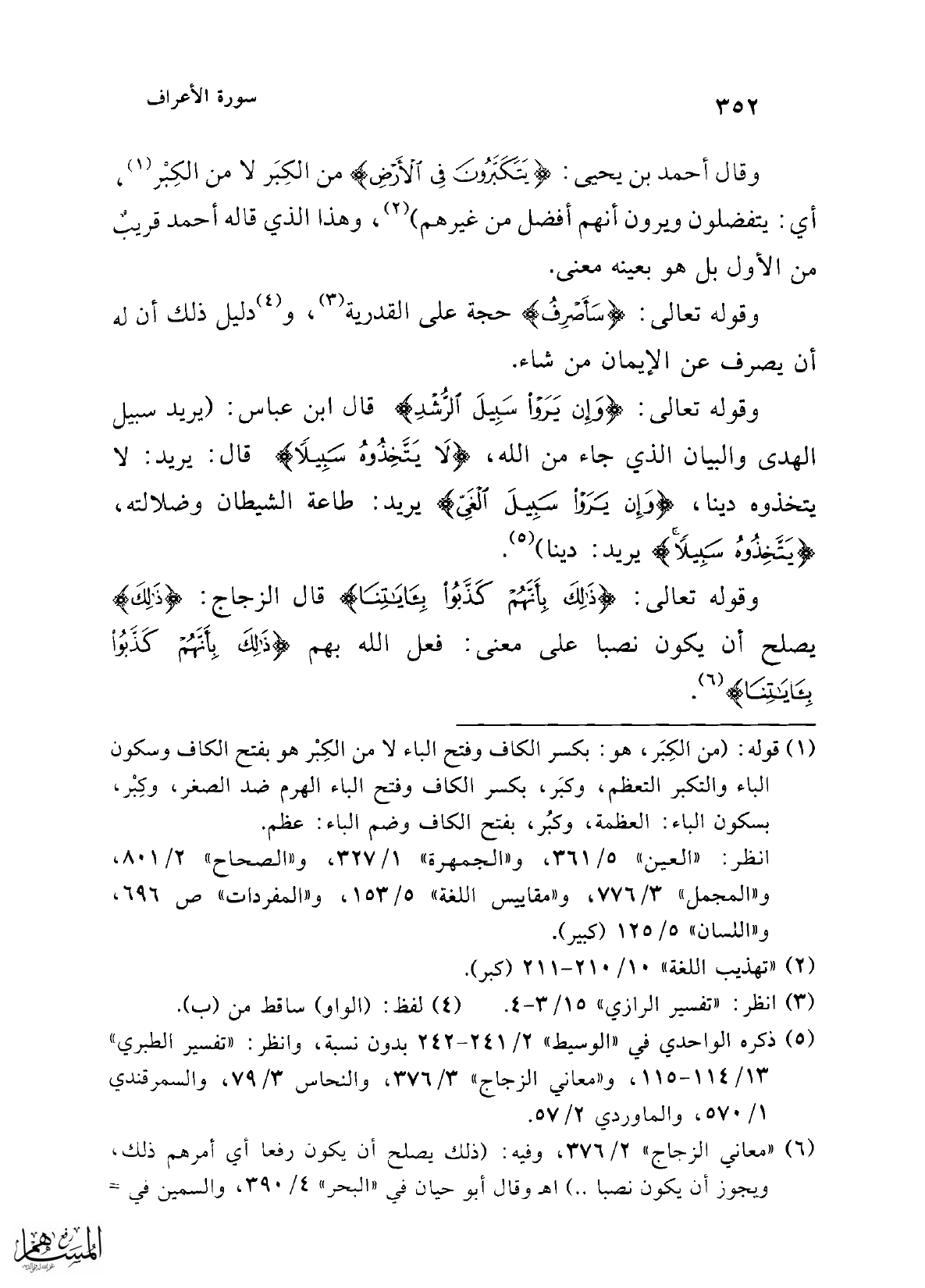 وقال أحمد بن يحيى: {يَتَكَبَّرُونَ فِي الْأَرْضِ} من الكِبَر لا من الكِبْر (¬1)، أي: يتفضلون ويرون أنهم أفضل من غيرهم) (¬2)، وهذا الذي قاله أحمد قريبٌ من الأول بل هو بعينه معنى.