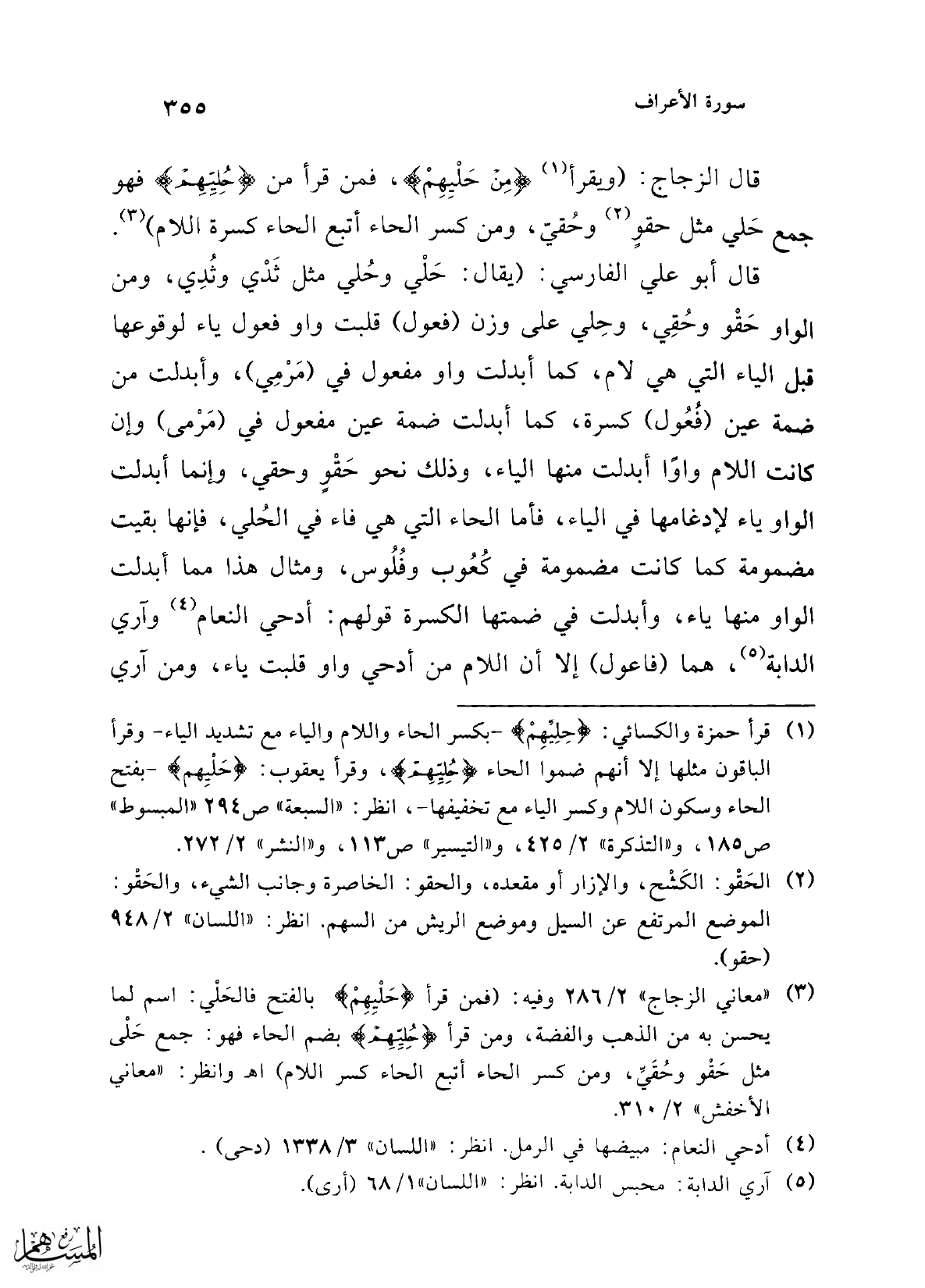 (¬3) "معاني الزجاج" 2/ 286 وفيه: (فمن قرأ {حَلْيِهِمْ} بالفتح فالحَلْي: اسم لما يحسن به من الذهب والفضة، ومن قرأ {حُلِيِّهِمْ} بضم الحاء فهو: جمع حَلْى مثل حَقْو وحُقَيِّ، ومن كسر الحاء أتبع الحاء كسر اللام) اهـ. وانظر: "معاني الأخفش" 2/ 310.