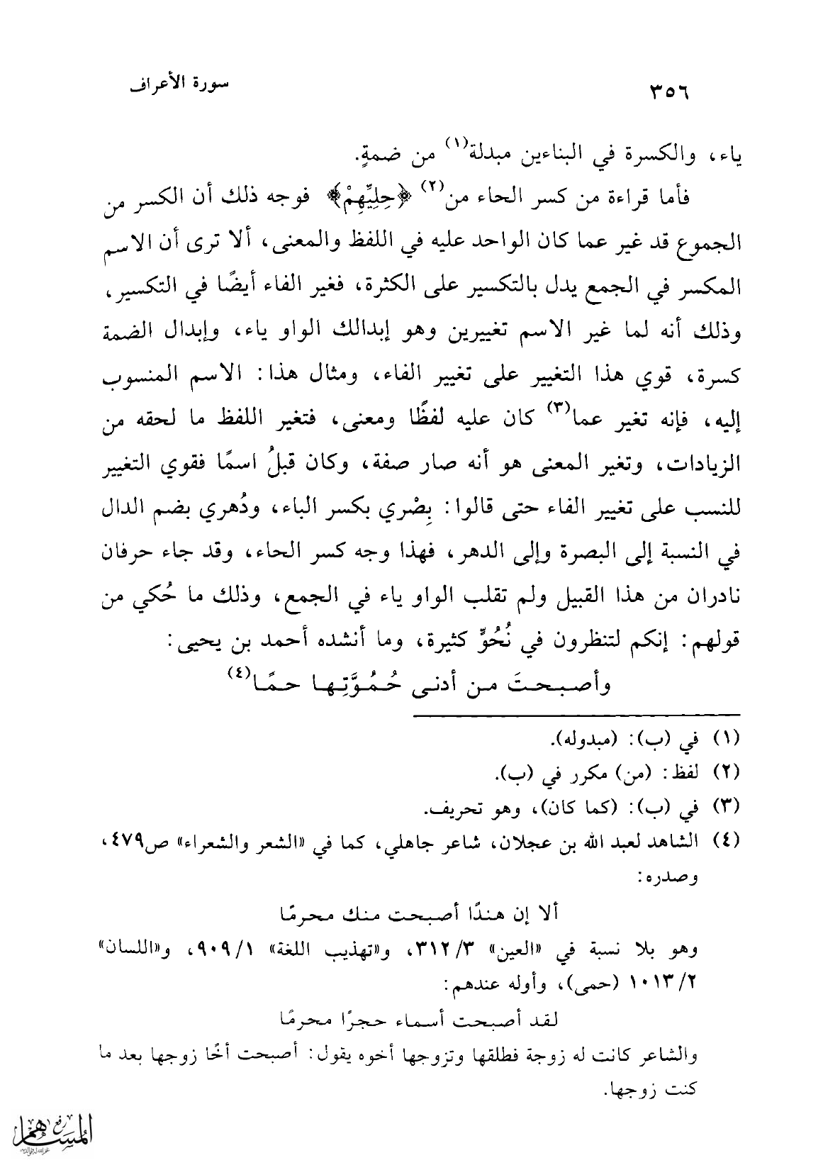 فأما قراءة من كسر الحاء من (¬2) {حُلِيِّهِمْ} فوجه ذلك أن الكسر من الجموع قد غير عما كان الواحد عليه في اللفظ والمعنى، ألا ترى أن الاسم المكسر في الجمع يدل بالتكسير على الكثرة، فغير الفاء أيضًا في التكسير، وذلك أنه لما غير الاسم تغييرين وهو إبدالك الواو ياء، وابدال الضمة كسرة، قوي هذا التغيير على تغيير الفاء، ومثال هذا: الاسم المنسوب إليه، فإنه تغير عما (¬3) كان عليه لفظًا ومعنى، فتغير اللفظ ما لحقه من الزيادات، وتغير المعنى هو أنه صار صفة، وكان قبلُ اسمًا فقوي التغيير للنسب على تغيير الفاء حتى قالوا: بِصْري بكسر الباء، ودُهري بضم الدال في النسبة إلى البصرة وإلى الدهر، فهذا وجه كسر الحاء، وقد جاء حرفان نادران من هذا القبيل ولم تقلب الواو ياء في الجمع، وذلك ما حُكي من قولهم: إنكم لتنظرون في نُحُوٍّ كثيرة، وما أنشده أحمد بن يحيى: