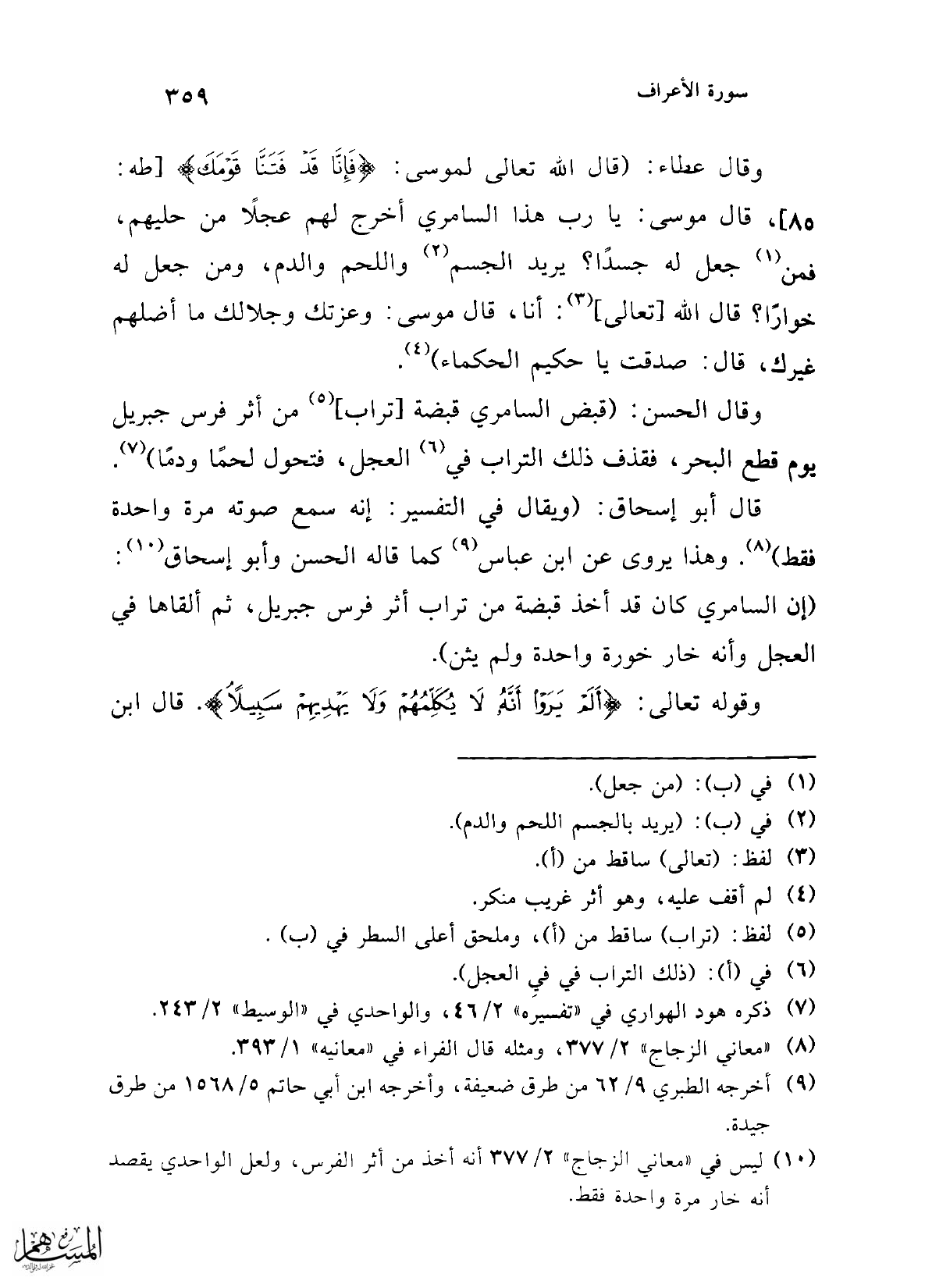 قال أبو إسحاق: (ويقال في التفسير: إنه سمع صوته مرة واحدة فقط) (¬8). وهذا يروى عن ابن عباس (¬9) كما قاله الحسن وأبو إسحاق (¬10): (إن السامري كان قد أخذ قبضة من تراب أثر فرس جبريل، ثم ألقاها في العجل وأنه خار خورة واحدة ولم يثن).