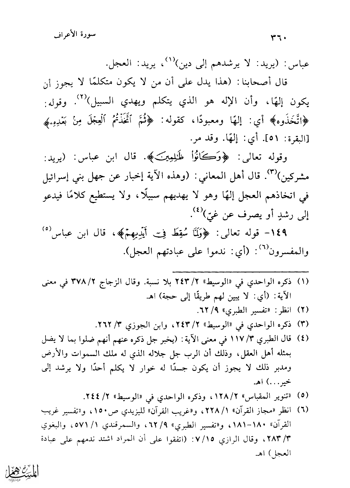 (¬4) قال الطبري 3/ 117 في معنى الآية: (يخبر جل ذكره عنهم أنهم ضلوا بما لا يضل بمثله أهل العقل، وذلك أن الرب جل جلاله الذي له ملك السموات والأرض ومدبر ذلك لا يجوز أن يكون جسدًا له خوار لا يكلم أحدًا ولا يرشد إلى خير ...) اهـ.