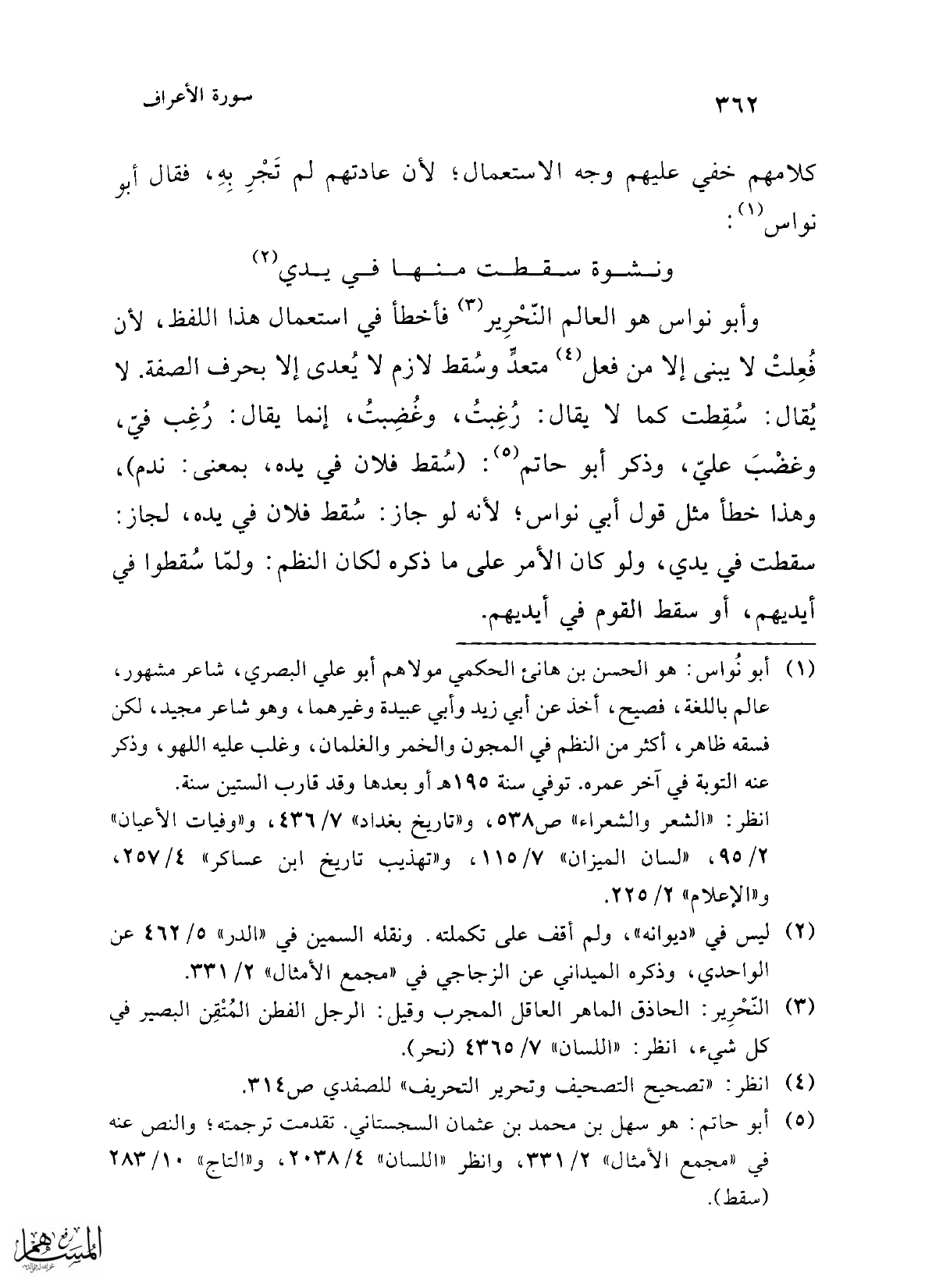 وأبو نواس هو العالم النّحْرِير (¬3) فأخطأ في استعمال هذا اللفظ؛ لأن فُعِلتْ لا يبنى إلا من فعل (¬4) متعدٍّ وسُقط لازم لا يُعدى إلا بحرف الصفة. لا يُقال: سُقِطت كما لا يقال: رُغِبتُ، وغُضبتُ، إنما يقال: رُغِب فيّ، وغضْبَ عليّ، وذكر أبو حاتم (¬5): (سُقط فلان في يده، بمعنى: ندم)، وهذا خطأ مثل قول أبي نواس؛ لأنه لو جاز: سُقط فلان في يده، لجاز: سقطت في يدي، ولو كان الأمر على ما ذكره لكان النظم: ولمّا سُقطوا في أيديهم، أو سقط القوم في أيديهم.