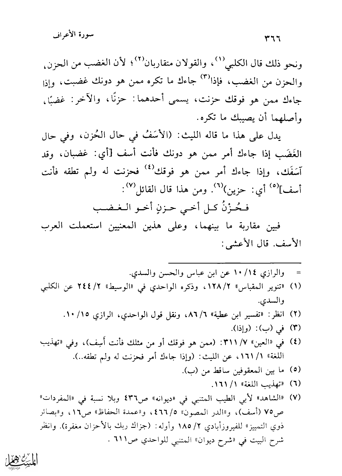 (¬7) "الشاهد" لأبي الطيب المتنبي في "ديوانه" ص 436 وبلا نسبة في "المفردات" ص 75 (أسف)، و"الدر المصون" 5/ 466، و"عمدة الحفاظ" ص 16، و"بصائر ذوي التمييز" للفيروزأبادي 2/ 185 وأوله: (جزاك ربك بالأحزان مغفرة). وانظر شرح البيت في "شرح ديوان" المتنبي للواحدي ص 611.