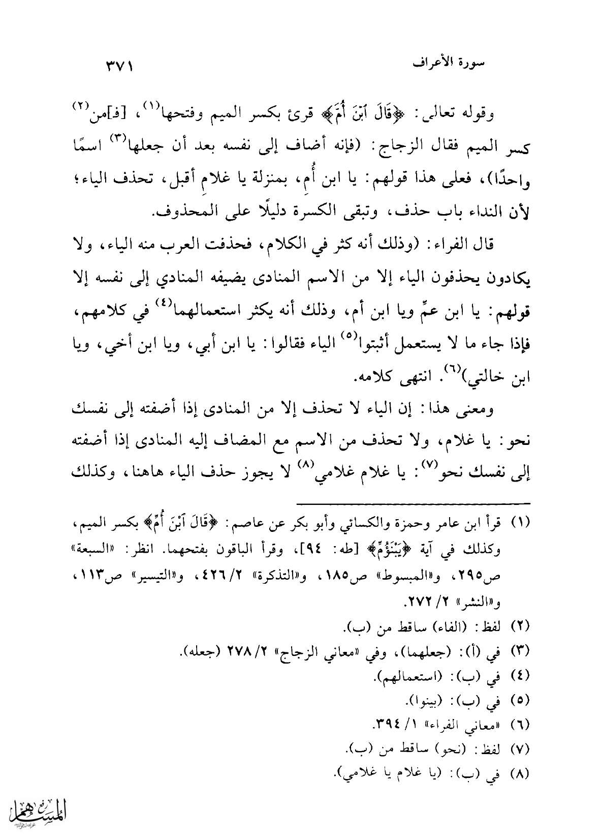 (¬1) قرأ ابن عامر وحمزة والكسائي وأبو بكر عن عاصم: {قَالَ ابْنَ أُمَّ} بكسر الميم، وكذلك في آية {يَبْنَؤُمَّ} [طه: 94]، وقرأ الباقون بفتحهما. انظر: "السبعة" ص 295، و"المبسوط" 185، و"التذكرة" 2/ 426، و"التيسير" ص 113، و"النشر" 2/ 272.