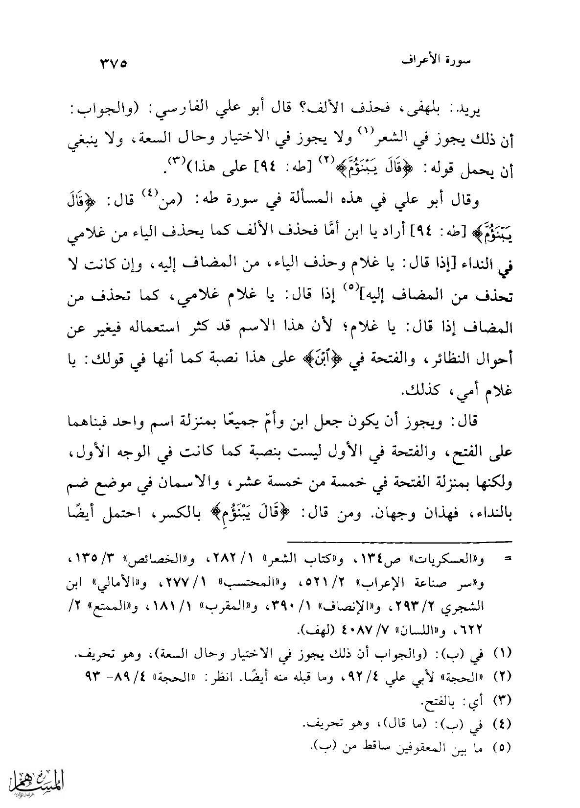وقال أبو علي في هذه المسألة في سورة طه: (من (¬4) قال: {قَالَ يَبْنَؤُمَّ} [طه: 94] أراد يا ابن أمَّا فحذف الألف كما يحذف الياء من غلامي في النداء [إذا قال: يا غلام وحذف الياء، من المضاف إليه، وإن كانت لا تحذف من المضاف إليه] (¬5) إذا قال: يا غلام غلامي، كما تحذف من المضاف إذا قال: يا غلام؛ لأن هذا الاسم قد كثر استعماله فيغير عن أحوال النظائر، والفتحة في {ابْنَ} على هذا نصبة كما أنها في قولك: يا غلام أمي، كذلك.