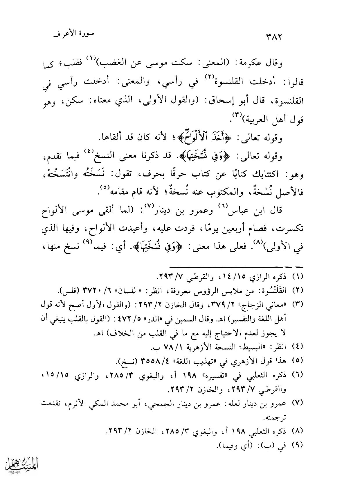 قال ابن عباس (¬6) وعمرو بن دينار (¬7): (لما ألقى موسى الألواح تكسرت، فصام أربعين يومًا، فردت عليه، وأعيدت الألواح، وفيها الذي في الأولى) (¬8). فعلى هذا معنى: {وَفِي نُسْخَتِهَا}. أي: فيما (¬9) نسخ منها،