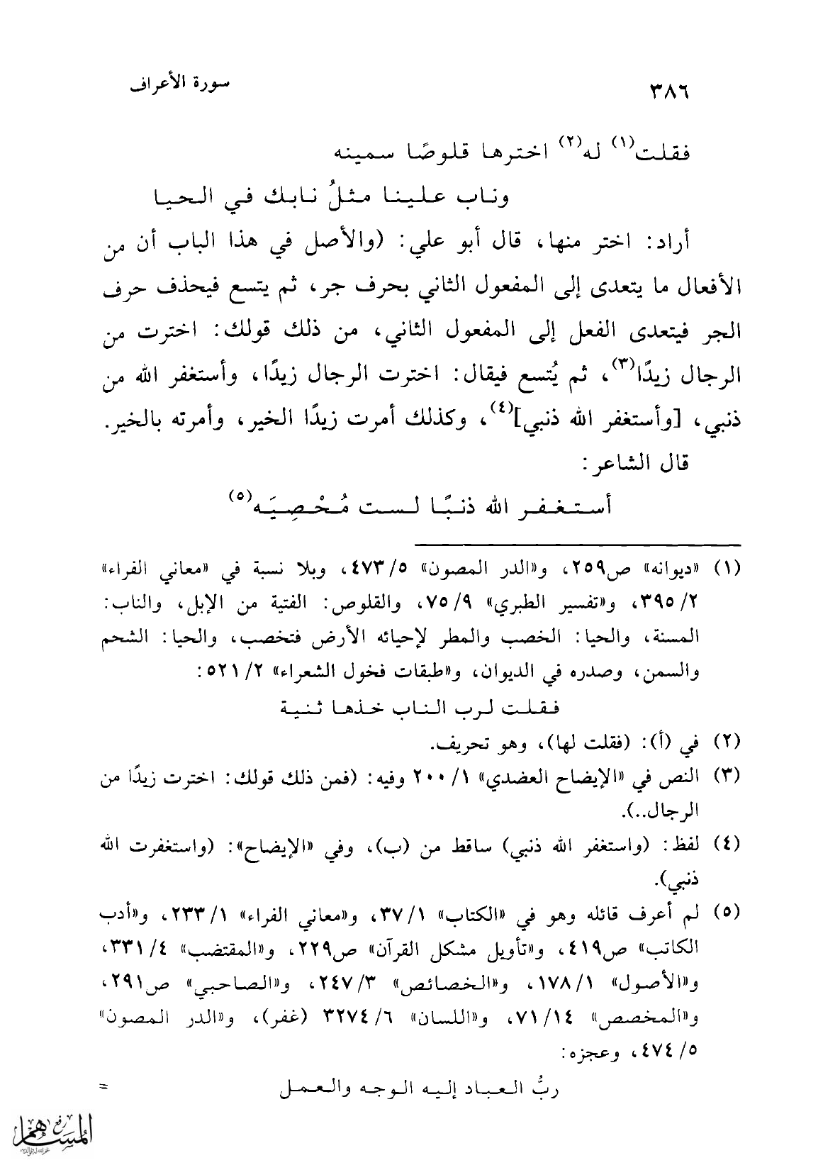 أراد: اختر منها، قال أبو علي: (والأصل في هذا الباب أن من الأفعال ما يتعدى إلى المفعول الثاني بحرف جر، ثم يتسع فيحذف حرف الجر فيتعدى الفعل إلى المفعول الثاني، من ذلك قولك: اخترت من الرجال زيدًا (¬3)، ثم يُتسع فيقال: اخترت الرجال زيدًا، وأستغفر الله من ذنبي، [وأستغفر الله ذنبي] (¬4)، وكذلك أمرت زيدًا الخير، وأمرته بالخير.