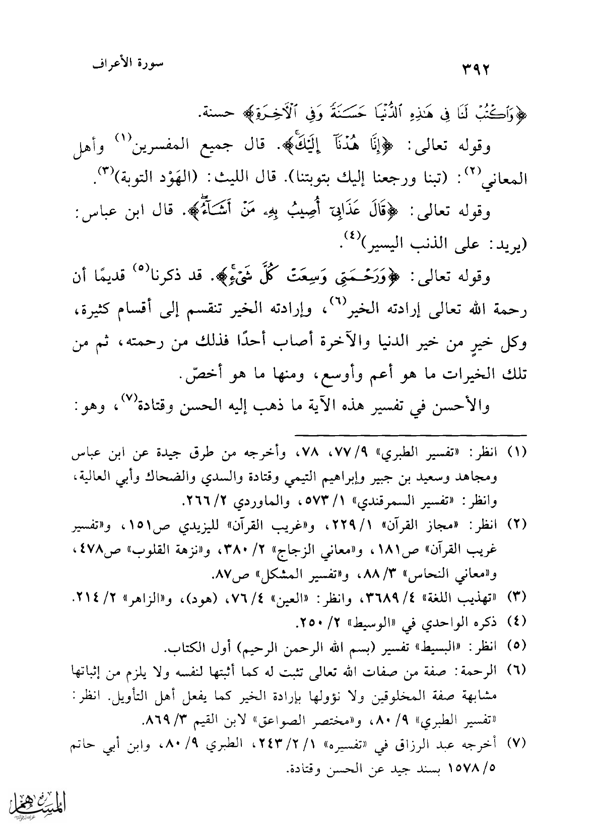 وقوله تعالى: {إِنَّا هُدْنَا إِلَيْكَ}. قال جميع المفسرين (¬1) وأهل المعاني (¬2): (تبنا ورجعنا إليك بتوبتنا). قال الليث: (الهَوْد التوبة) (¬3).