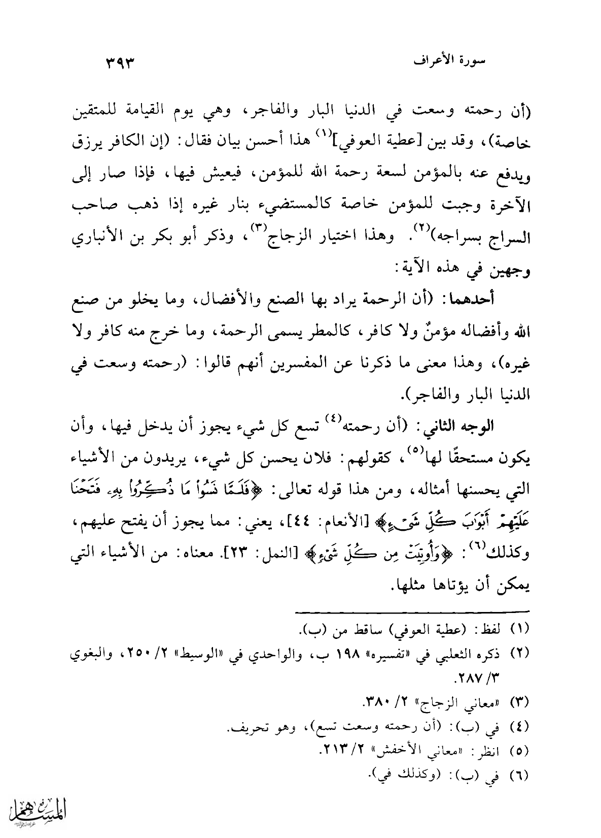 الوجه الثاني: (أن رحمته (¬4) تسع كل شيء يجوز أن يدخل فيها، وأن يكون مستحقًا لها (¬5)، كقولهم: فلان يحسن كل شيء، يريدون من الأشياء التي يحسنها أمثاله، ومن هذا قوله تعالى: {فَلَمَّا نَسُوا مَا ذُكِّرُوا بِهِ فَتَحْنَا عَلَيْهِمْ أَبْوَابَ كُلِّ شَيْءٍ} [الأنعام: 44]، يعني: مما يجوز أن يفتح عليهم، وكذلك (¬6): {وَأُوتِيَتْ مِنْ كُلِّ شَيْءٍ} [النمل: 23]. معناه: من الأشياء التي يمكن أن يؤتاها مثلها.