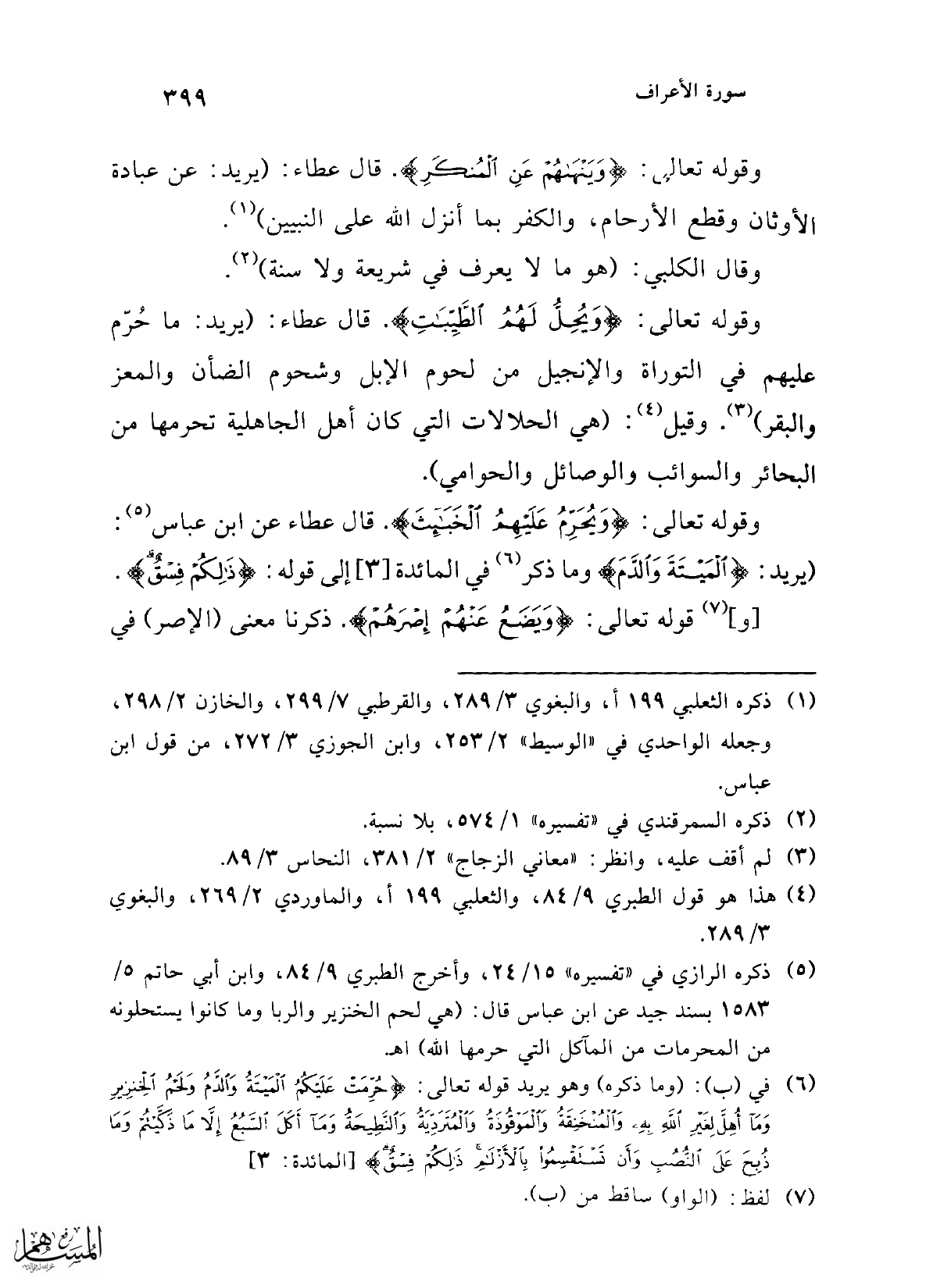 وقوله تعالى: {وَيُحِلُّ لَهُمُ الطَّيِّبَاتِ}. قال عطاء: (يريد: ما حُرّم عليهم في التوراة والإنجيل من لحوم الإبل وشحوم الضأن والمعز والبقر) (¬3). وقيل (¬4): (هي الحلالات التي كان أهل الجاهلية تحرمها من البحائر والسوائب والوصائل والحوامي).