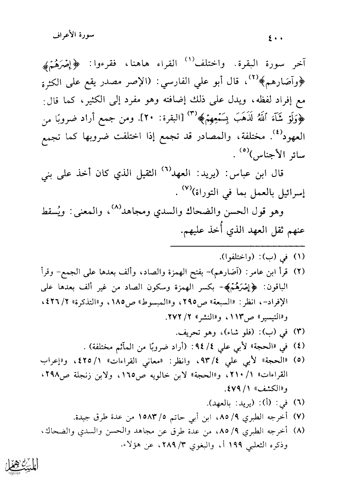 آخر سورة البقرة. واختلف (¬1) القراء هاهنا، فقرءوا: {إِصْرَهُمْ} {وآصَارهم} (¬2)، قال أبو علي الفارسي: (الإصر مصدر يقع على الكثرة مع إفراد لفظه، ويدل على ذلك إضافته وهو مفرد إلى الكثير، كما قال: {وَلَوْ شَاءَ اللَّهُ لَذَهَبَ بِسَمْعِهِمْ} (¬3) [البقرة: 20]. ومن جمع أراد ضروبًا من العهود (¬4). مختلفة، والمصادر قد تجمع إذا اختلفت ضروبها كما تجمع سائر الأجناس) (¬5).
