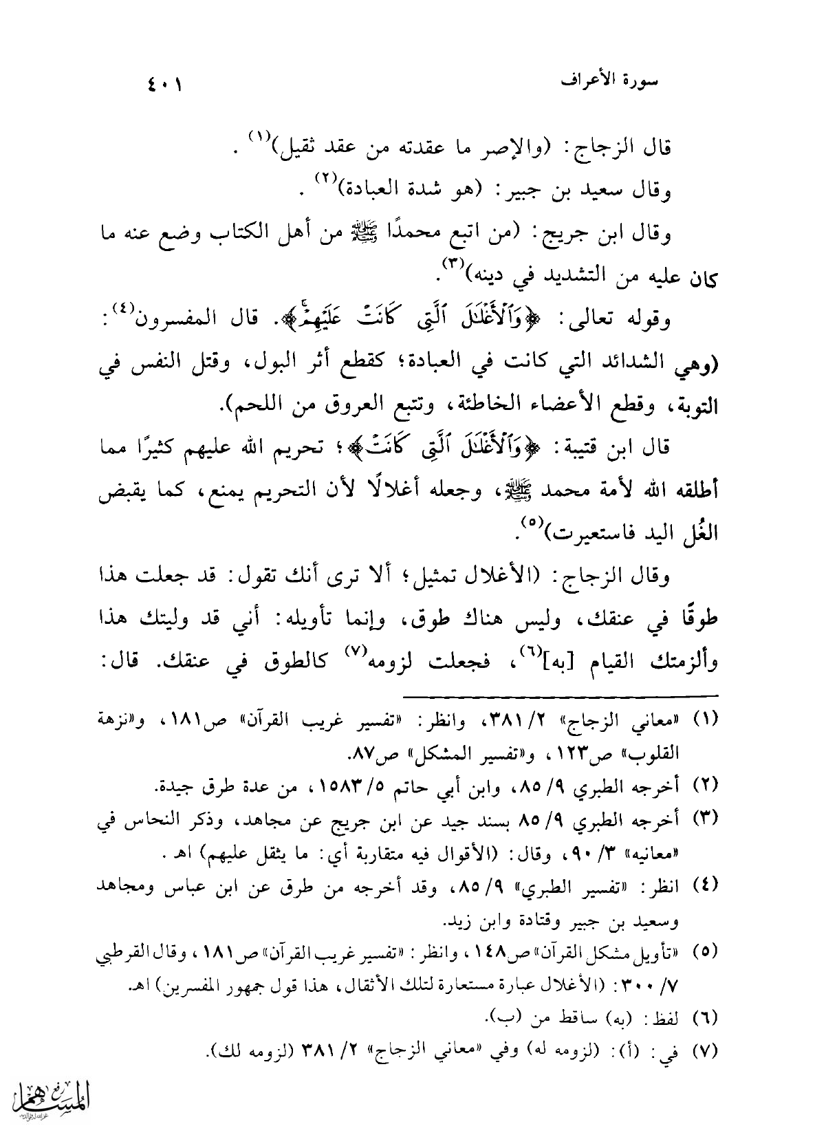 (¬5) "تأويل مشكل القرآن" ص 148، وانظر: "تفسير غريب القرآن" ص 181، وقال القرطبي 7/ 300: (الأغلال عبارة مستعارة لتلك الأثقال، هذا قول جمهور المفسرين) اهـ.