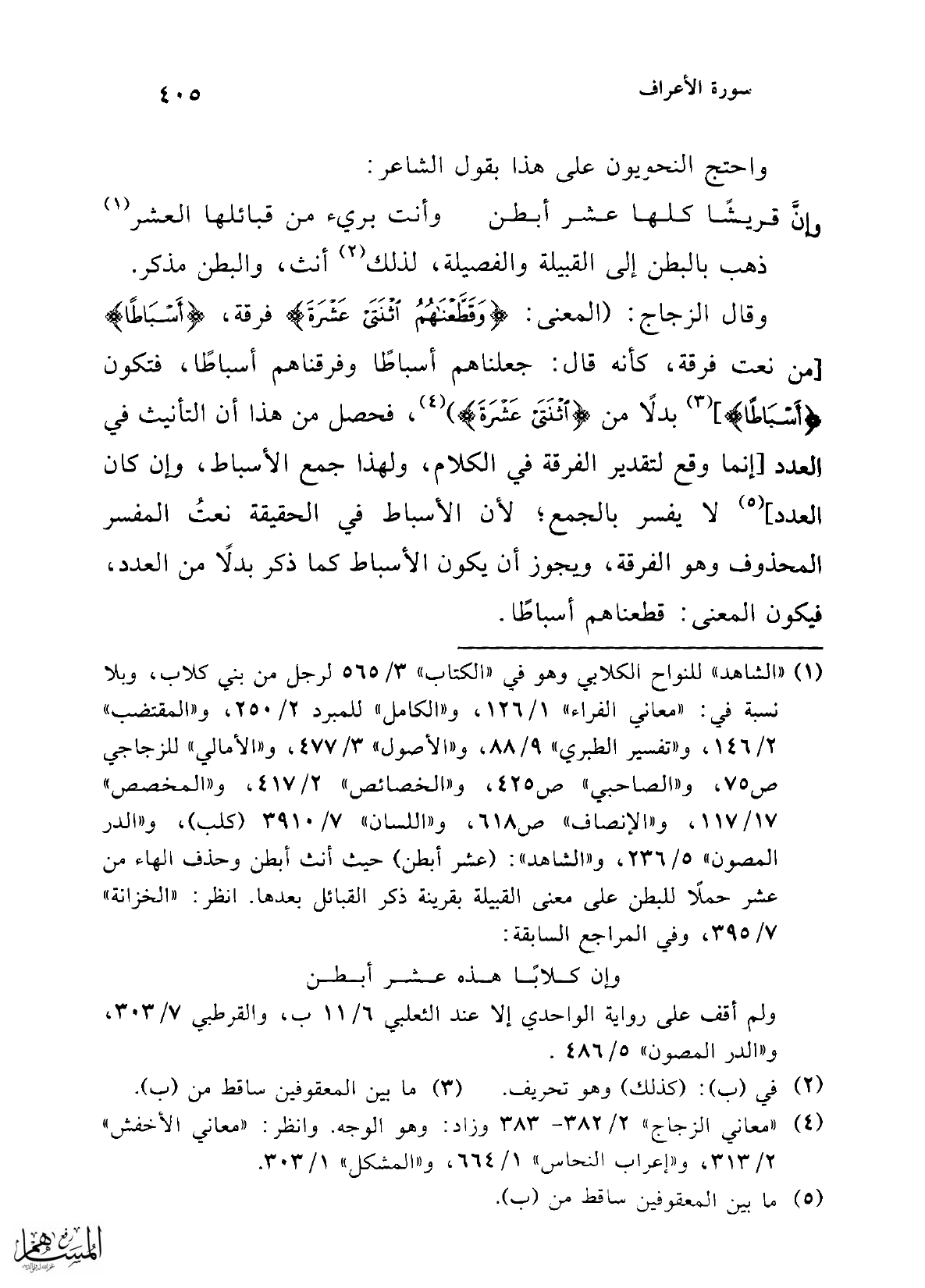 وقال الزجاج: (المعنى: {وَقَطَّعْنَاهُمُ اثْنَتَيْ عَشْرَةَ} فرقة، {أَسْبَاطًا} [من نعت فرقة، كأنه قال: جعلناهم أسباطًا وفرقناهم أسباطًا، فتكون {أَسْبَاطًا}] (¬3) بدلاً من {اثْنَتَيْ عَشْرَةَ}) (¬4)، فحصل من هذا أن التأنيث في العدد [إنما وقع لتقدير الفرقة في الكلام، ولهذا جمع الأسباط، وإن كان العدد] (¬5) لا يفسر بالجمع؛ لأن الأسباط في الحقيقة نعتُ المفسر المحذوف وهو الفرقة، ويجوز أن يكون الأسباط كما ذكر بدلاً من العدد، فيكون المعنى: قطعناهم أسباطًا.
