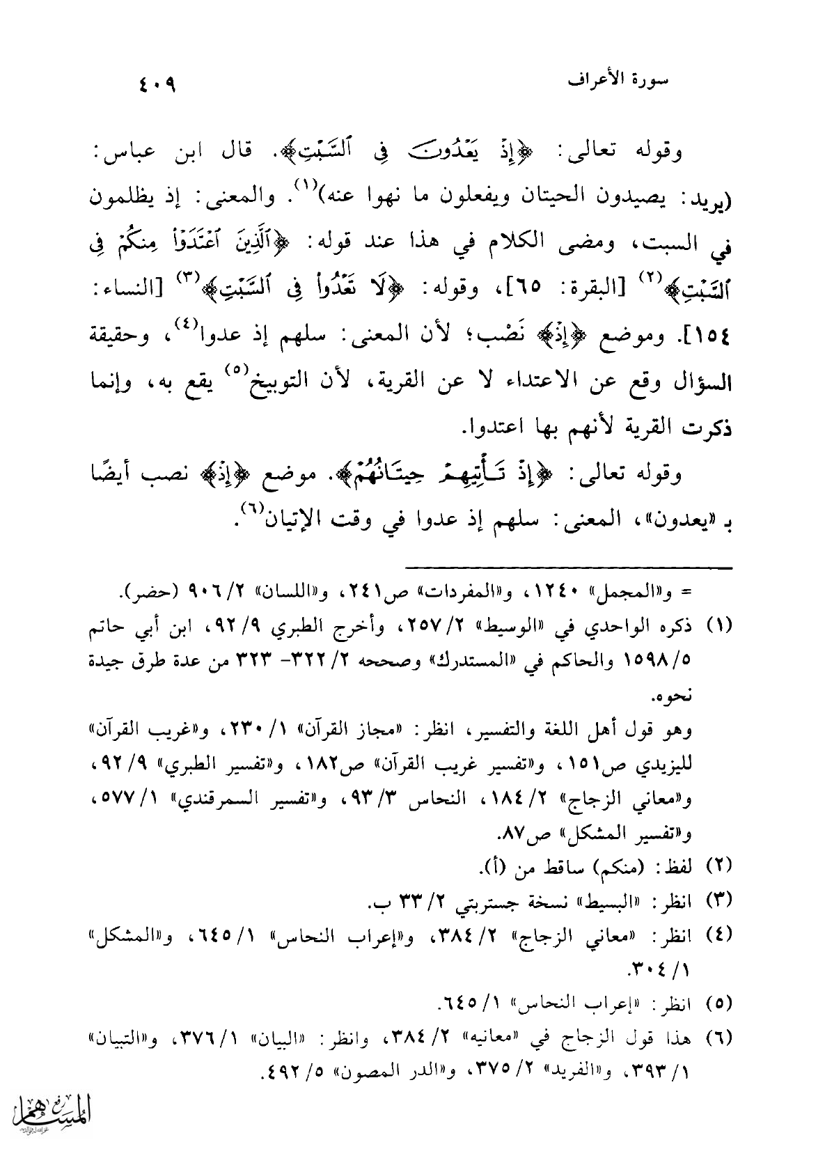وقوله تعالى: {إِذْ يَعْدُونَ فِي السَّبْتِ}. قال ابن عباس: (يريد: يصيدون الحيتان ويفعلون ما نهوا عنه) (¬1). والمعنى: إذ يظلمون في السبت، ومضى الكلام في هذا عند قوله: {الَّذِينَ اعْتَدَوْا مِنْكُمْ فِي السَّبْتِ} (¬2) [البقرة: 65]، وقوله: {لَا تَعْدُوا فِي السَّبْتِ} (¬3) [النساء: 154]. وموضع {إِذْ} نَصْب؛ لأن المعنى: سلهم إذ عدوا (¬4)، وحقيقة السؤال وقع عن الاعتداء لا عن القرية؛ لأن التوبيخ (¬5) يقع به، وإنما ذكرت القرية لأنهم بها اعتدوا.