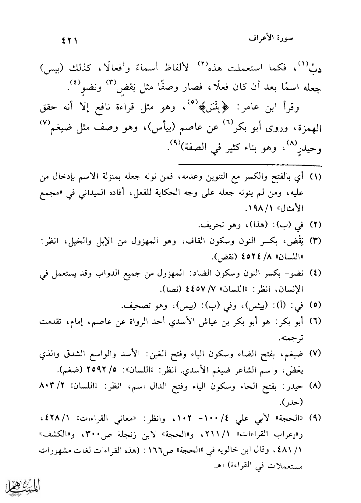 (¬7) ضيغم، بفتح الضاء وسكون الياء وفتح الغين: الأسد والواسع الشدق والذي يعَضَ، واسم الشاعر ضيغم الأسدي. انظر: "اللسان": 5/ 2592 (ضغم).