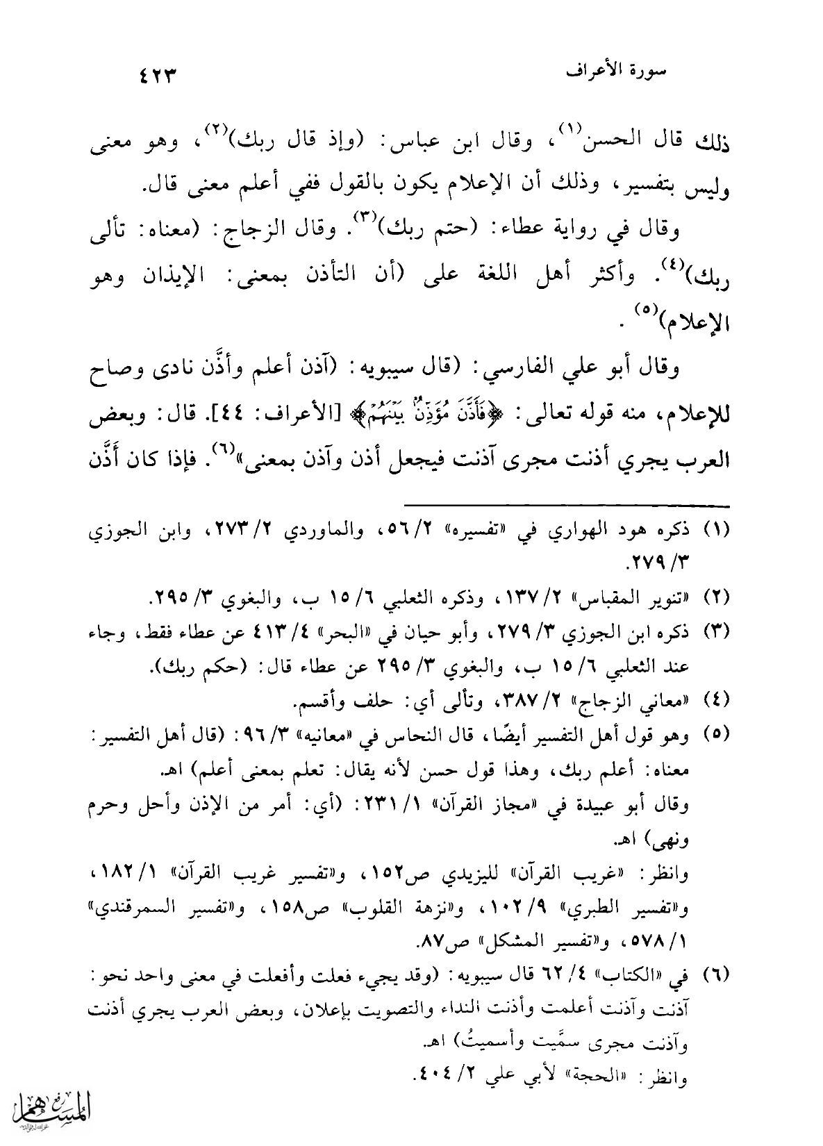 وقال أبو علي الفارسي: (قال سيبويه: (آذن أعلم وأذَّن نادى وصاح للأعلام، منه قوله تعالى: {فَأَذَّنَ مُؤَذِّنٌ بَيْنَهُمْ} [الأعراف: 44]. قال: وبعض العرب يجري أذنت مجرى آذنت فيجعل أذن وآذن بمعنى" (¬6). فإذا كان أَذَّن