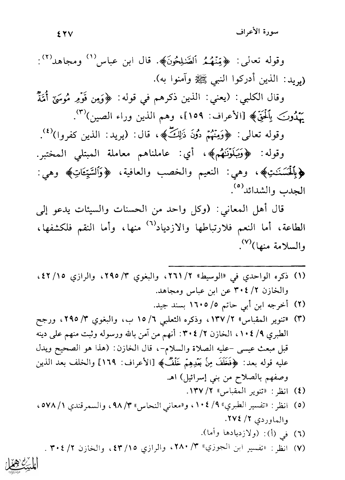 (¬3) "تنوير المقباس" 2/ 137، وذكره الثعلبي 6/ 15 ب، والبغوي 3/ 295، ورجح الطبري 9/ 104، الخازن 2/ 304: أنهم من آمن بالله ورسوله وثبت منهم على دينه قبل مبعث عيسى -عليه الصلاة والسلام -، قال الخارن: (هذا هو الصحيح ويدل عليه قوله بعد: {فَخَلَفَ مِنْ بَعْدِهِمْ خَلْفٌ} [الأعراف:169] والخلف بعد الذين وصفهم بالصلاح من بني إسرائيل) اهـ.
