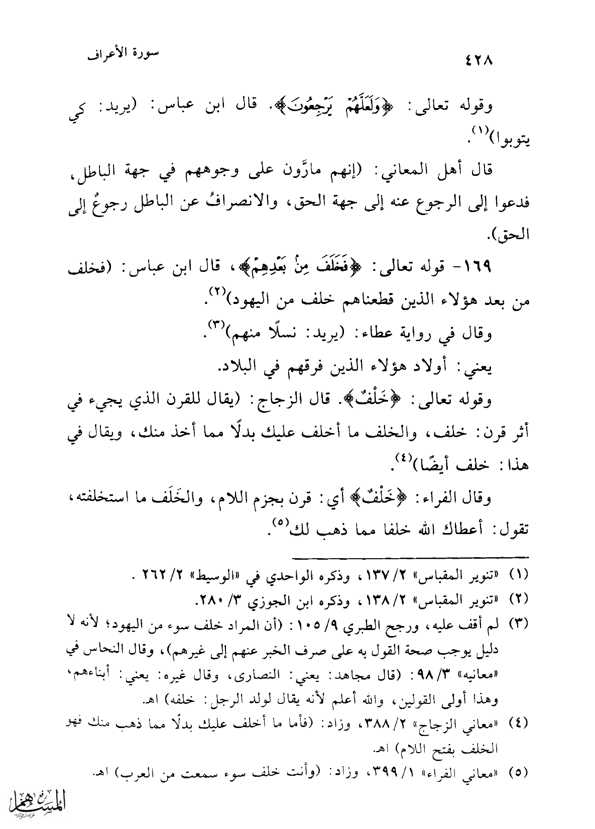 169 - قوله تعالى: {فَخَلَفَ مِنْ بَعْدِهِمْ}، قال ابن عباس: (فخلف من بعد هؤلاء الذين قطعناهم خلف من اليهود) (¬2).