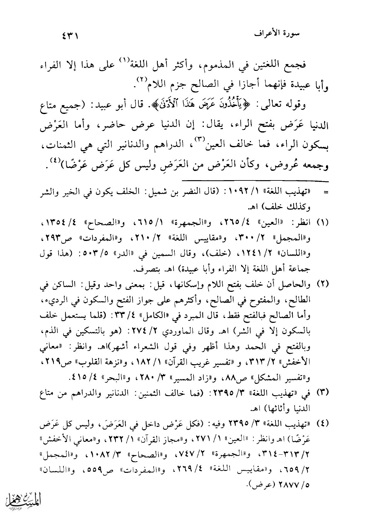 (¬4) "تهذيب اللغة" 3/ 2395 وفيه: (فكل عَرْض داخل في العَرَضَ، وليس كل عَرَض عَرْضًا) اهـ. وانظر: "العين" 1/ 271، و"مجاز القرآن" 1/ 232، و"معاني الأخفش" 2/ 313 - 314، و"الجمهرة" 2/ 747، و"الصحاح" 3/ 1082، و"المجمل" 2/ 659، و"مقاييس اللغة" 4/ 269، و"المفردات" ص 559 , و"اللسان" 5/ 2877 (عرض).