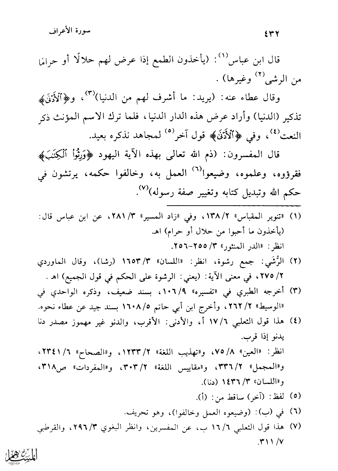 قال المفسرون: (ذم الله تعالى بهذه الآية اليهود {وَرِثُوا الْكِتَابَ} فقرؤوه، وعلموه، وضيعوا (¬6) العمل به، وخالفوا حكمه، يرتشون في حكم الله وتبديل كتابه وتغيير صفة رسوله) (¬7).