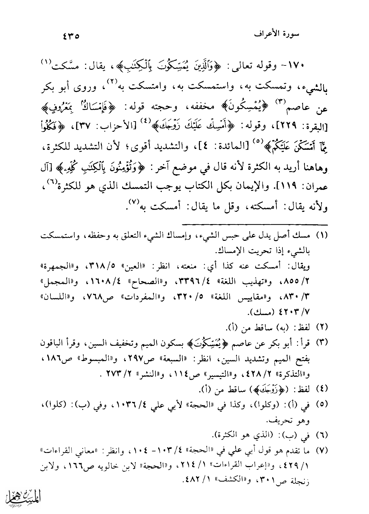 170 - وقوله تعالى: {وَالَّذِينَ يُمَسِّكُونَ بِالْكِتَابِ}، يقال: مسَّكت (¬1) بالشيء، وتمسكت به، واستمسكت به، وامتسكت به (¬2)، وروى أبو بكر عن عاصم (¬3) {يُمْسِكُونَ} مخففه، وحجته قوله: {فَإِمْسَاكٌ بِمَعْرُوفٍ} [البقرة: 229]، وقوله: {أَمْسِكْ عَلَيْكَ زَوْجَكَ} (¬4) [الأحزاب: 37]، {فَكُلُوا مِمَّا أَمْسَكْنَ عَلَيْكُمْ} (¬5) [المائدة: 4]، والتشديد أقوى , لأن التشديد للكثرة، وهاهنا أريد به الكثرة لأنه قال في موضع آخر: {وَتُؤْمِنُونَ بِالْكِتَابِ كُلِّهِ} [آل عمران: 119]. والإيمان بكل الكتاب يوجب التمسك الذي هو للكثرة (¬6)، ولأنه يقال: أمسكته، وقيل ما يقال: أمسكت به (¬7).