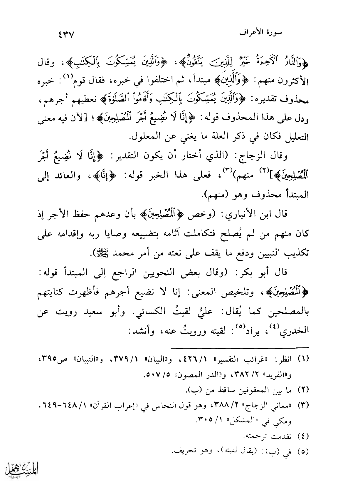 {وَالدَّارُ الْآخِرَةُ خَيْرٌ لِلَّذِينَ يَتَّقُونَ}، {وَالَّذِينَ يُمَسِّكُونَ بِالْكِتَابِ}، وقال الأكثرون منهم: {وَالَّذِينَ} مبتدأ، ثم اختلفوا في خبره، فقال قوم (¬1): خبره محذوف تقديره: {وَالَّذِينَ يُمَسِّكُونَ بِالْكِتَابِ وَأَقَامُوا الصَّلَاةَ} نعطيهم أجرهم، ودل على هذا المحذوف قوله: {إِنَّا لَا نُضِيعُ أَجْرَ الْمُصْلِحِينَ}؛ [لأن فيه معنى التعليل فكان في ذكر العلة ما يغني عن المعلول.