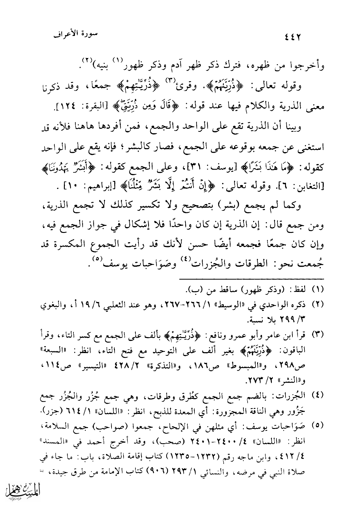 وكما لم يجمع (بشر) بتصحيح ولا تكسير كذلك لا تجمع الذرية، ومن جمع قال: إن الذرية إن كان واحداً فلا إشكال في جواز الجمع فيه، وإن كان جمعًا فجمعه أيضًا حسن لأنك قد رأيت المجموع المكسرة قد جُمعت نحو: الطرقات والجُزرات (¬4) وصَوَاحبات يوسف (¬5).