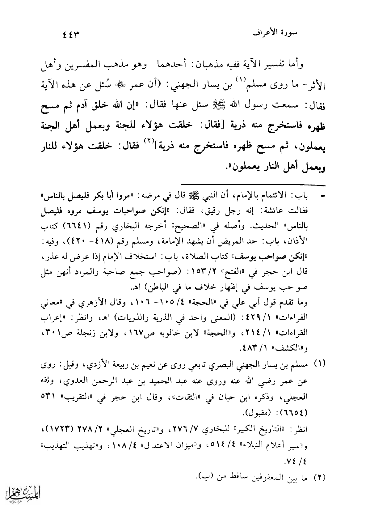 وأما تفسير الآية ففيه مذهبان: أحدهما -وهو مذهب المفسرين وأهل الأثر- ما روى مسلم (¬1) بن يسار الجهني: (أن عمر - رضي الله عنه - سُئل عن هذه الآية فقال: سمعت رسول الله - صلى الله عليه وسلم - سئل عنها فقال: "إن الله خلق آدم ثم مسح ظهره فاستخرج منه ذرية [فقال: خلقت هؤلاء للجنة وبعمل أهل الجنة يعملون، ثم مسح ظهره فاستخرج منه ذرية] (¬2) فقال: خلقت هؤلاء للنار وبعمل أهل النار يعملون".