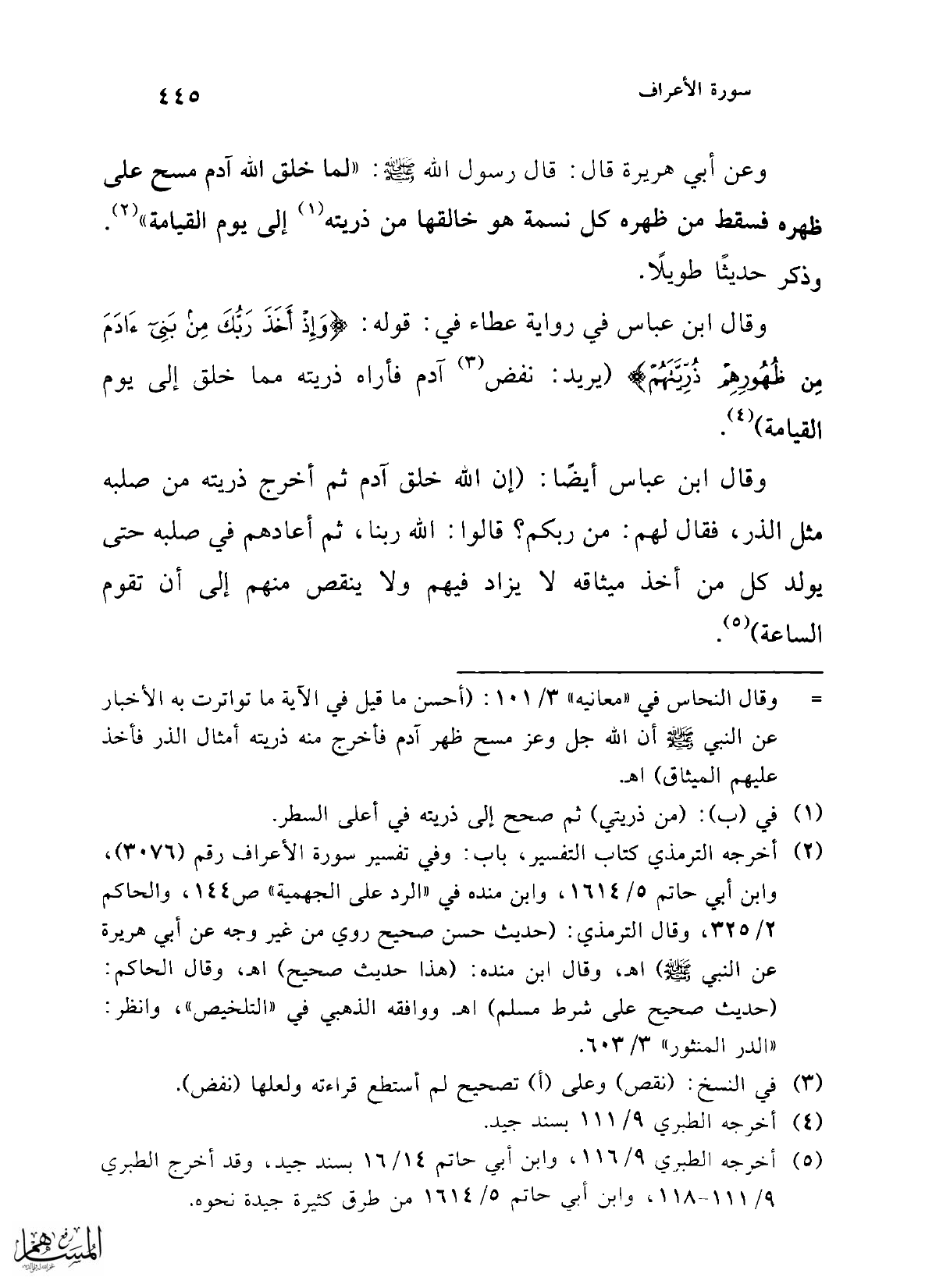 = وقال النحاس في "معانيه" 3/ 101: (أحسن ما قيل في الآية ما تواترت به الأخبار عن النبي - صلى الله عليه وسلم - أن الله جل وعز مسح ظهر آدم فأخرج منه ذريته أمثال الذر فأخذ عليهم الميثاق) اهـ.