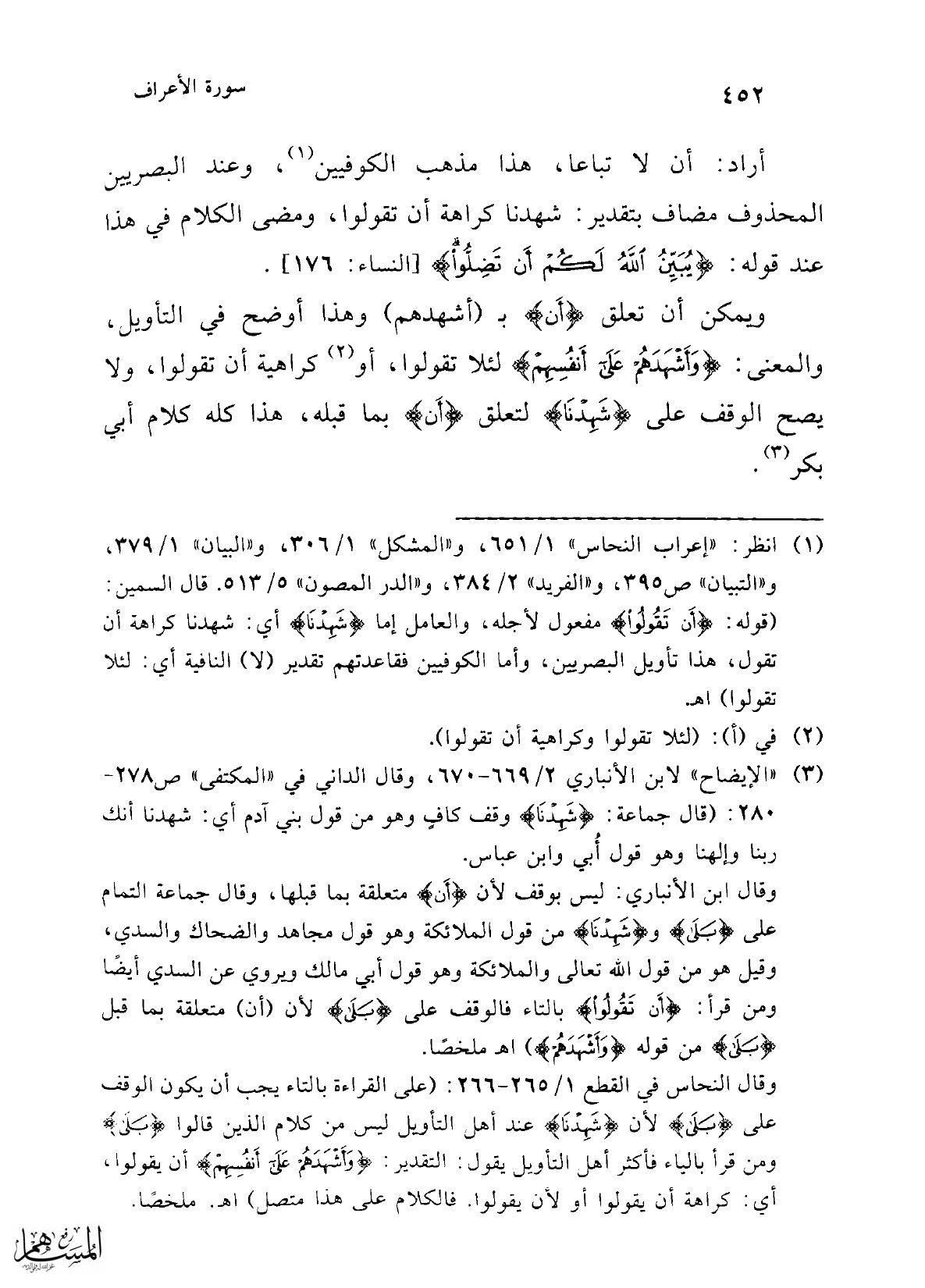 وقال النحاس في القطع 1/ 265 - 266: (على القراءة بالتاء يجب أن يكون الوقف على {بَلَى} لأن {شَهِدْنَا} عند أهل التأويل ليس من كلام الذين قالوا {بَلَى} ومن قرأ بالياء فأكثر أهل التأويل يقول: التقدير: {وَأَشْهَدَهُمْ عَلَى أَنْفُسِهِمْ} أن يقولوا، أي: كراهة أن يقولوا أو لأن يقولوا. فالكلام على هذا متصل) اهـ. ملخصًا.