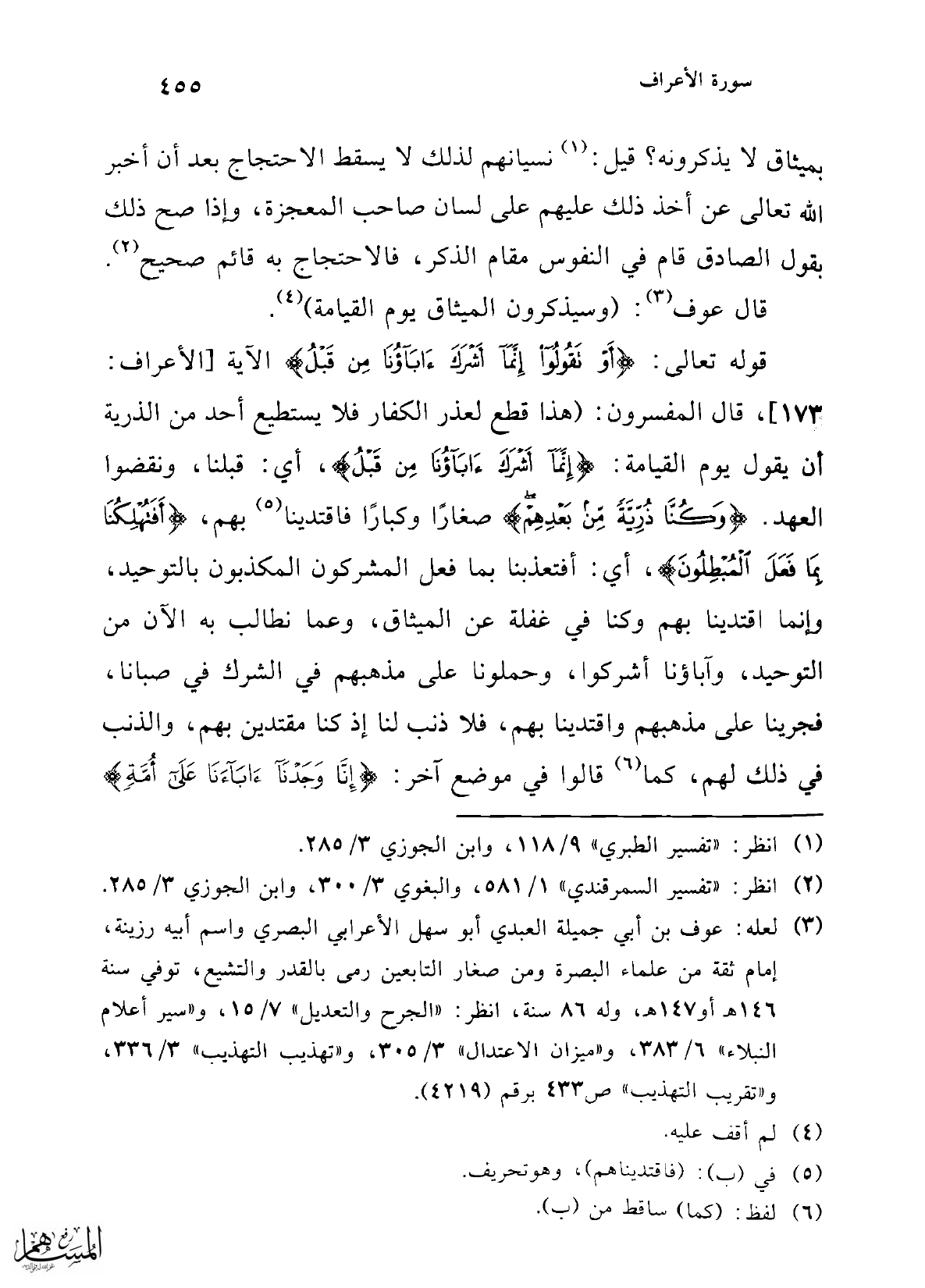 قوله تعالى: {أَوْ تَقُولُوا إِنَّمَا أَشْرَكَ آبَاؤُنَا مِنْ قَبْلُ} الآية [الأعراف:173]، قال المفسرون: (هذا قطع لعذر الكفار فلا يستطيع أحد من الذرية أن يقول يوم القيامة: {إِنَّمَا أَشْرَكَ آبَاؤُنَا مِنْ قَبْلُ}، أي: قبلنا، ونقضوا العهد. {وَكُنَّا ذُرِّيَّةً مِنْ بَعْدِهِمْ} صغارًا وكبارًا فاقتدينا (¬5) بهم، {أَفَتُهْلِكُنَا بِمَا فَعَلَ الْمُبْطِلُونَ}، أي: أفتعذبنا بما فعل المشركون المكذبون بالتوحيد، وإنما اقتدينا بهم وكنا في غفلة عن الميثاق، وعما نطالب به الآن من التوحيد، وآباؤنا أشركوا، وحملونا على مذهبهم في الشرك في صبانا، فجرينا على مذهبهم واقتدينا بهم، فلا ذنب لنا إذ كنا مقتدين بهم، والذنب في ذلك لهم، كما (¬6) قالوا في موضع آخر: {إِنَّا وَجَدْنَا آبَاءَنَا عَلَى أُمَّةٍ}