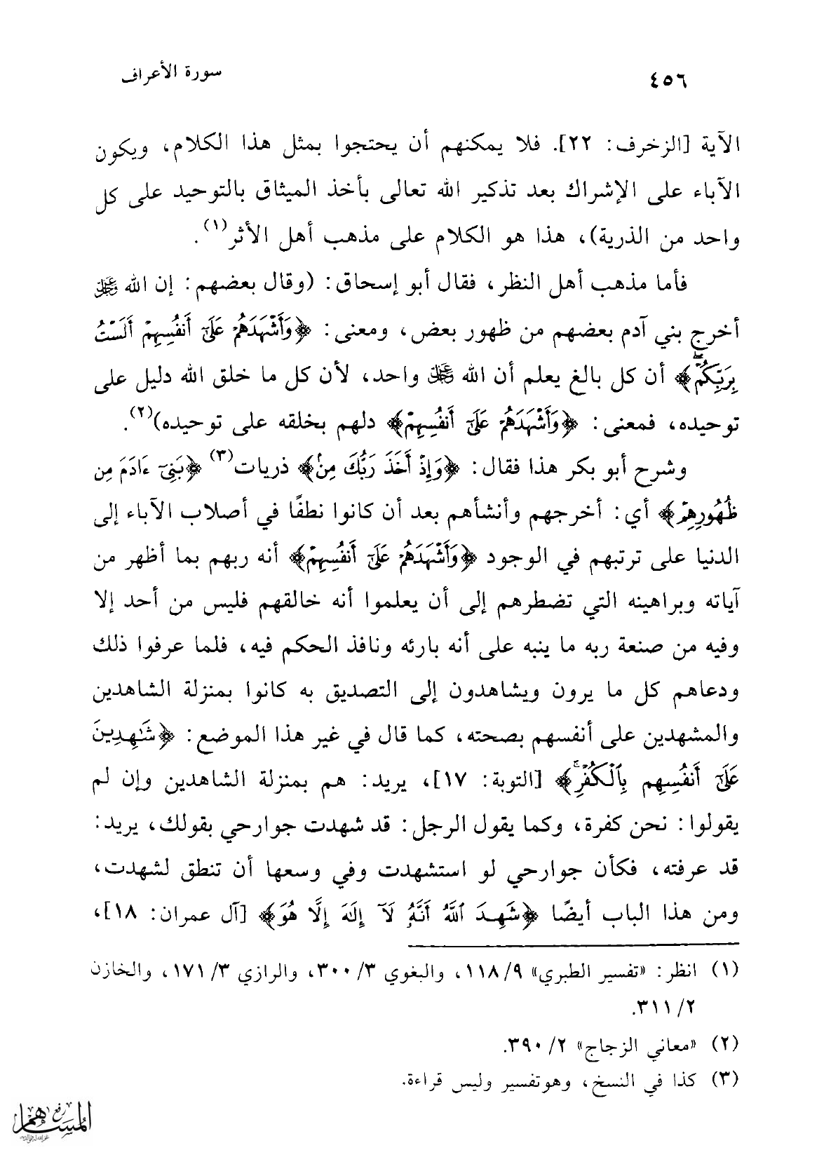 فأما مذهب أهل النظر، فقال أبو إسحاق: (وقال بعضهم: إن الله عز وجل أخرج بني آدم بعضهم من ظهور بعض، ومعنى: {وَأَشْهَدَهُمْ عَلَى أَنْفُسِهِمْ أَلَسْتُ بِرَبِّكُمْ} أن كل بالغ يعلم أن الله عز وجل واحد، لأن كل ما خلق الله دليل على توحيده، فمعنى: {وَأَشْهَدَهُمْ عَلَى أَنْفُسِهِمْ} دلهم بخلقه على توحيده) (¬2).